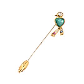 in oro giallo e bianco 18kt, realizzata a forma di uccellino, impreziosita da uno smeraldo taglio a goccia di ct 0.90 circa, un diamante taglio ovale di ct 0.15 circa, due diamanti taglio tapes, uno zaffiro e un rubino calibrati, lungh. cm 6, gr. 6