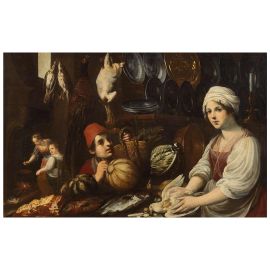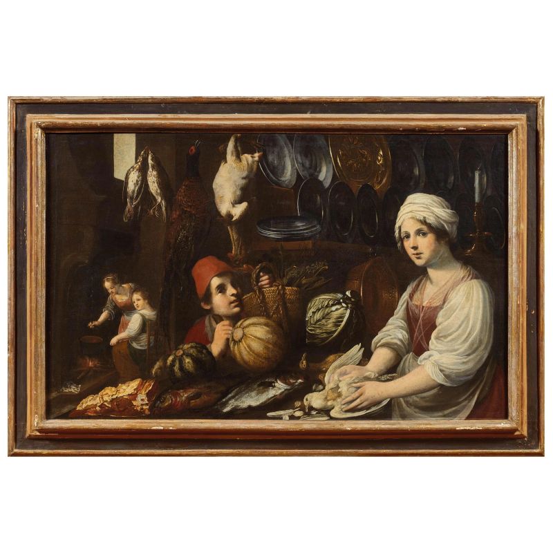 INTERNO DI CUCINA CON GIOVANE, SELVAGGINA E ORTAGGI