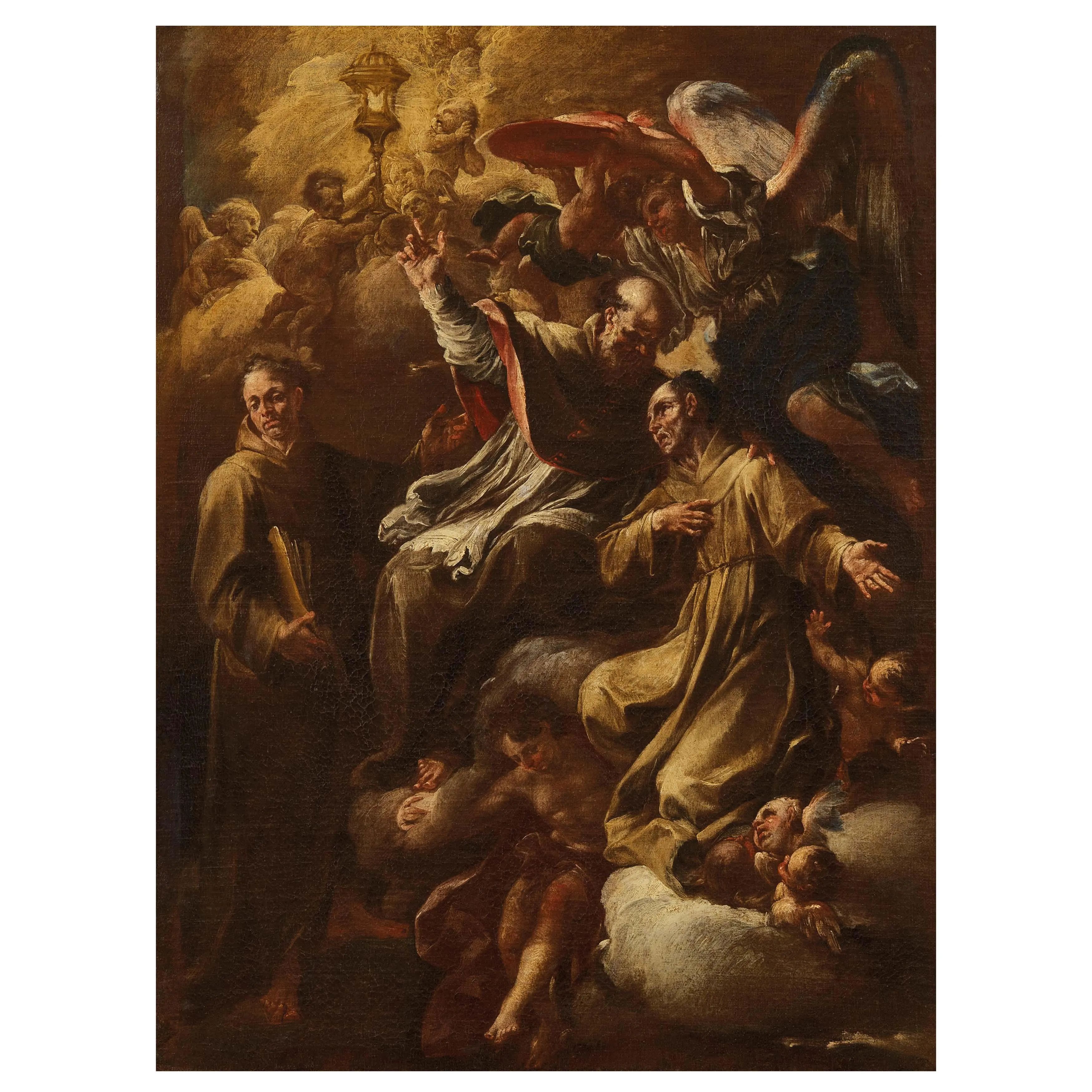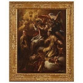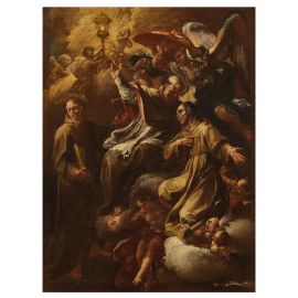 I SANTI GIACOMO DELLA MARCA, BONAVENTURA E BERNARDINO DA SIENA IN ADORAZIONE DELL'EUCARESTIA olio su tela, cm 60x46