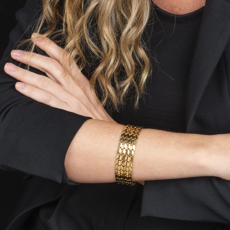 in oro giallo 18kt, realizzato a maglia piatta, punzone 750 e del fabbricante, lungh. cm 19, gr. 34