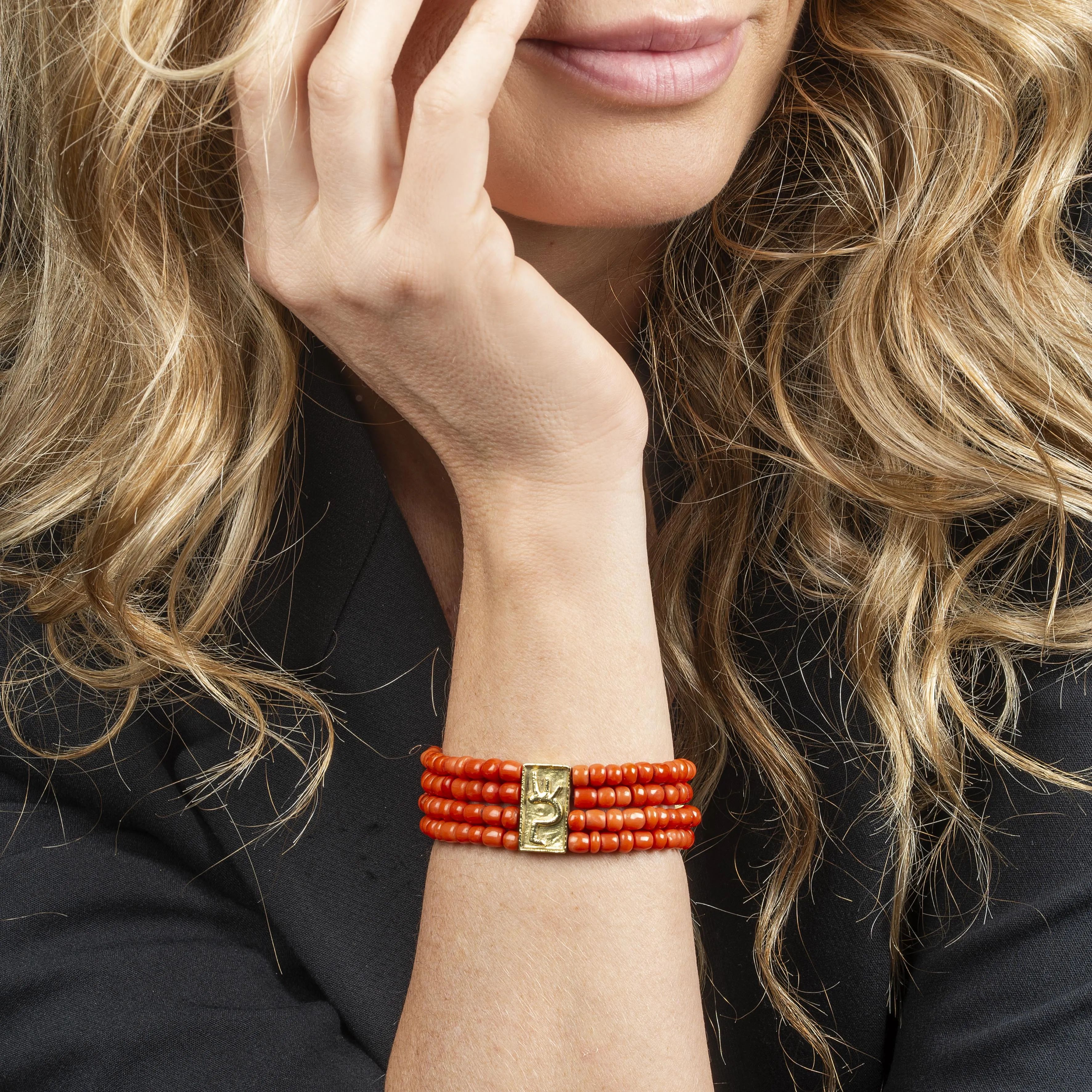 realizzato da quattro fili di corallo di mm 1 circa, fermatura in oro giallo 18kt con raffigurato un motivo, lungh. cm 17.2, gr. 33