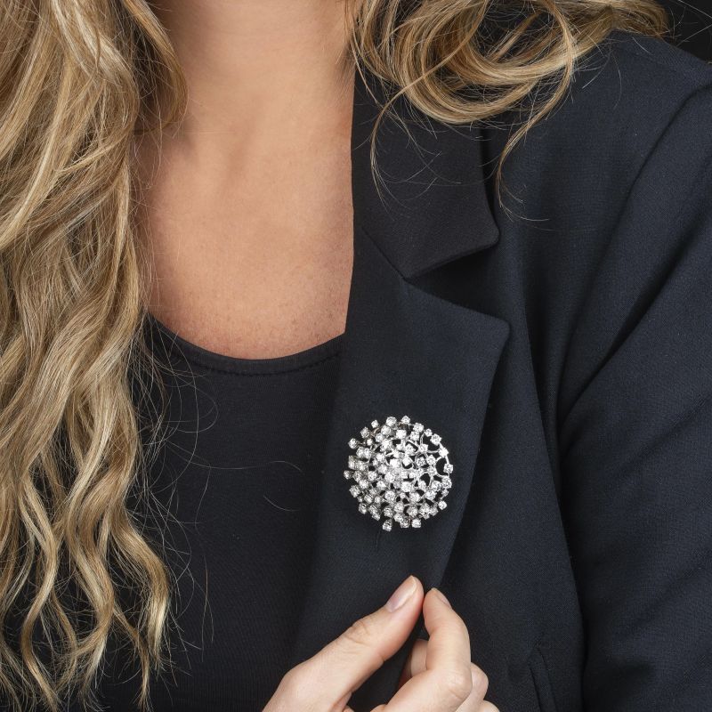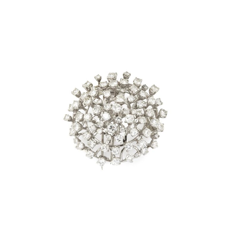 in oro bianco 18kt, impreziosita da diamanti taglio brillante per ct. 7 circa, punzoni 750 e del fabbricante, dim. cm 4x3.7, gr. 27