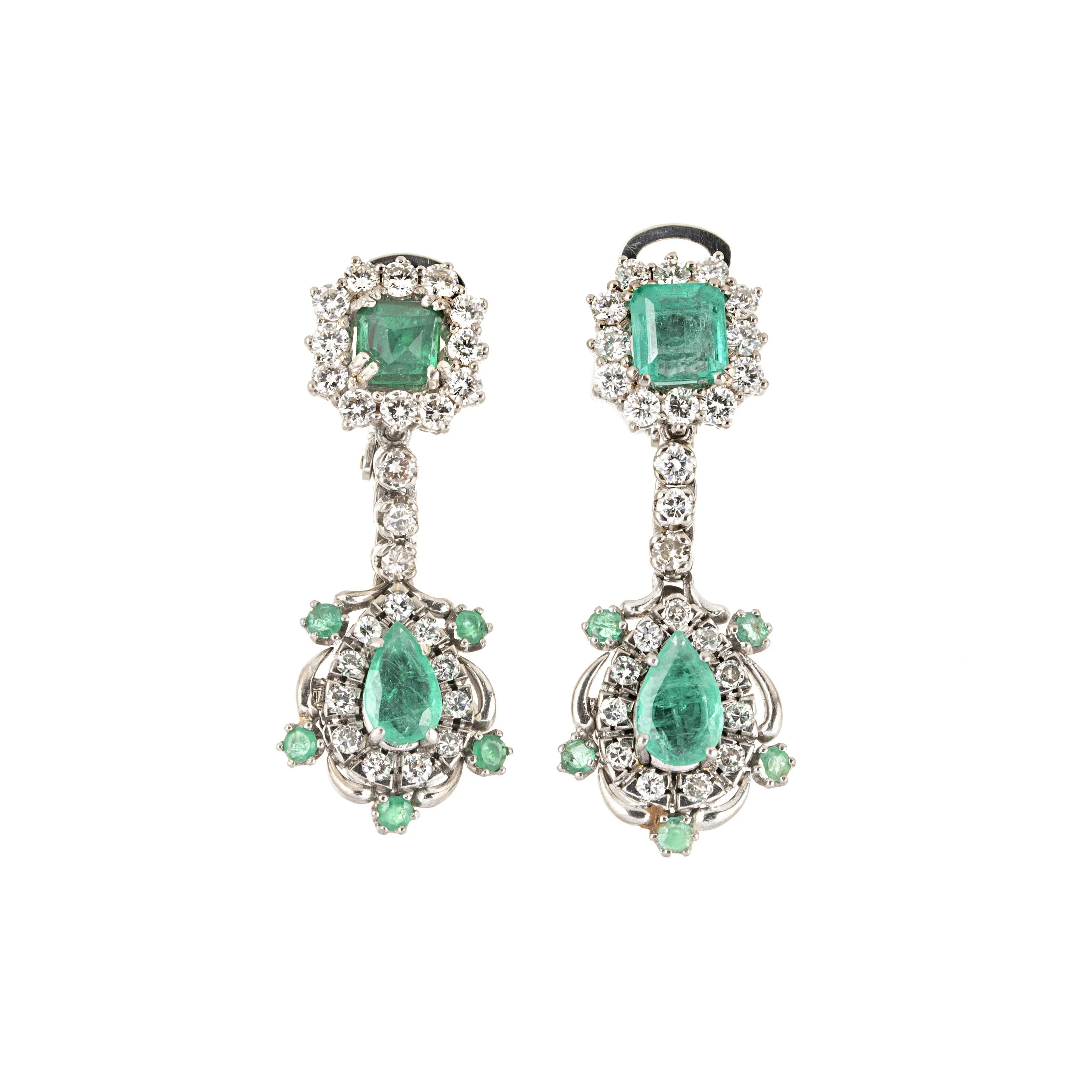 in oro bianco 18kt, impreziositi da diamanti taglio brilante per ct. 2.3 circa complessivi e smeraldi taglio ottagonale, a goccia e tondi per ct. 3.5 circa complessivi, cm. 4x1.5, gr. 18.5