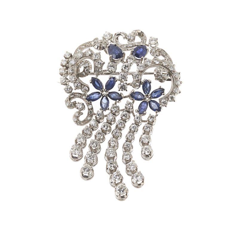 in oro bianco 18kt, impreziosita da diamanti taglio brillante e huit huit per ct. 3 circa complessivi e zaffiri taglio navette e goccia per ct. 1.20 circa complessivi, cm. 4.5x3.5, gr. 16.5