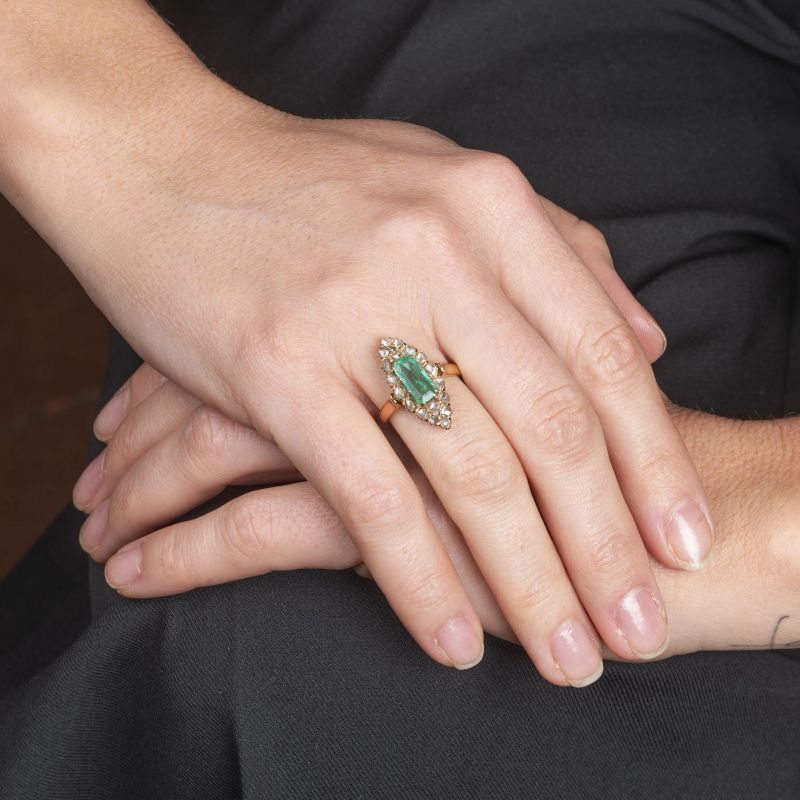 in oro rosa 18kt, al centro uno smeraldo taglio ottagonale per ct. 1 circa, circondato da diamanti taglio a rosa, mis. 12/52, gr. 4