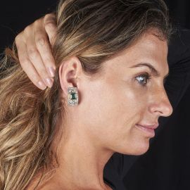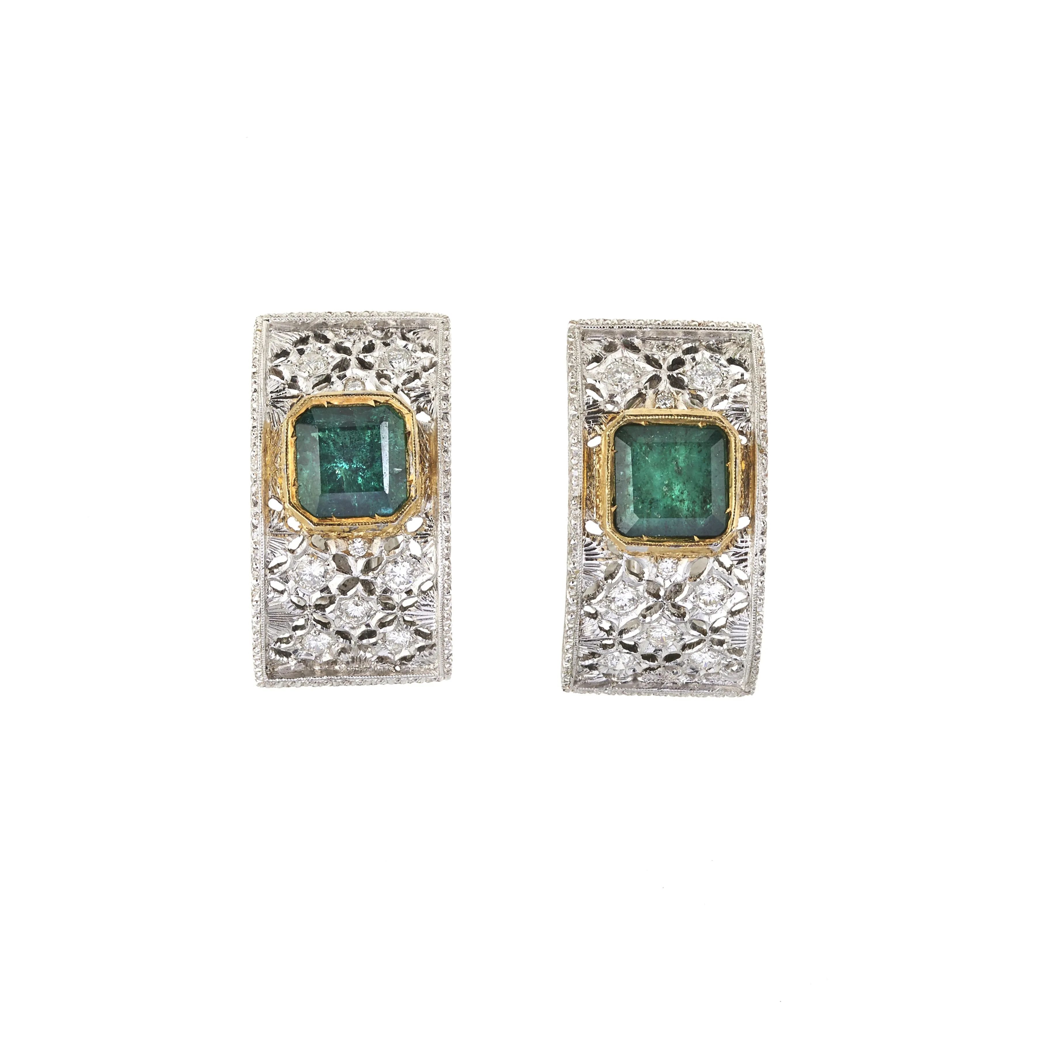 in oro bianco e giallo 18kt, impreziositi da smeraldi taglio ottagonale per ct. 4 circa e diamanti taglio brillante per ct. 1.50 circa, chiusura a clip, cm. 2.5x1.4, gr. 19