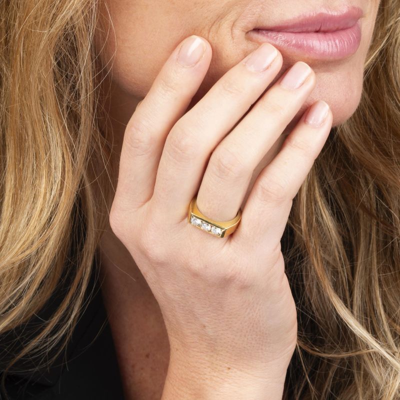 in oro giallo 18kt, impreziosito da tre diamanti taglio brillante per ct. 0.75 complessivi, punzone 750, mis. 14/54, gr. 6