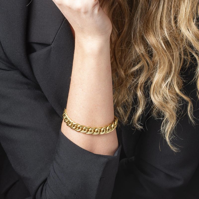 in oro giallo 18kt, composto da una serie di maglie concatenate, punzone 750 e del fabbricante, lungh. cm 20.6, gr. 18