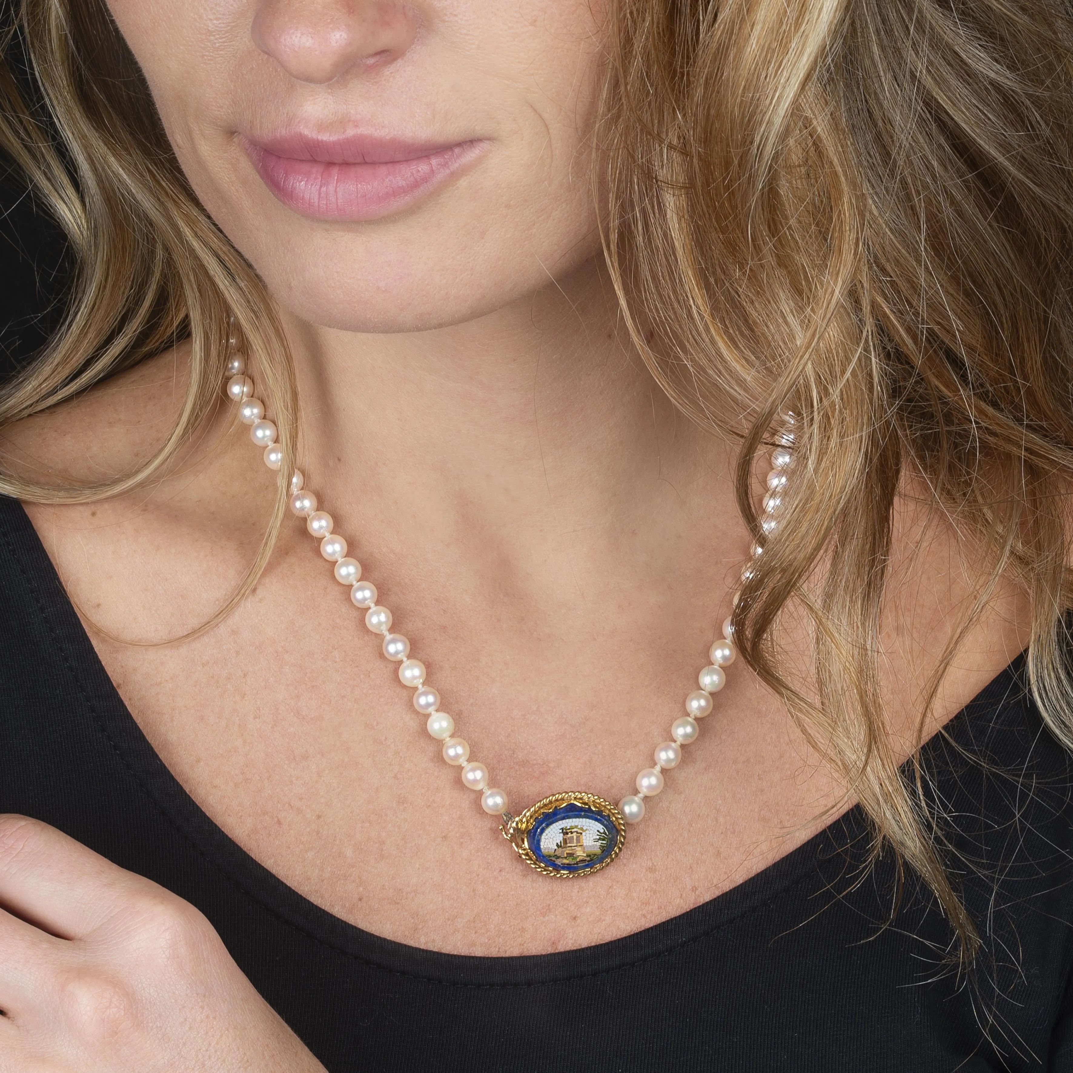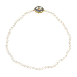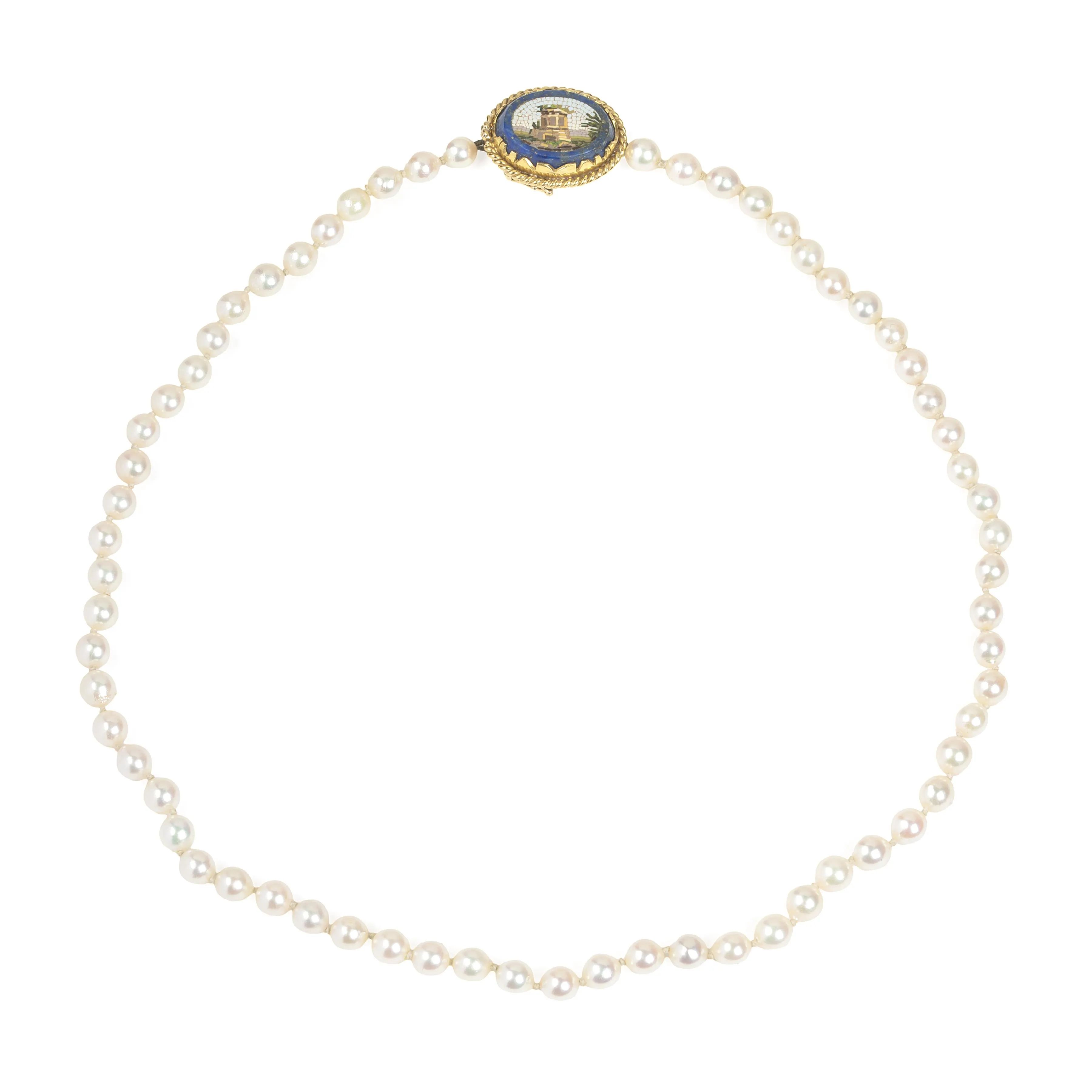 composta da un filo di perle coltivate di mm. 6.5 circa, chiusura in oro giallo 18kt con micromosaico su lapislazuli, punzone 750 e del fabbricante, cm.45, gr. 33