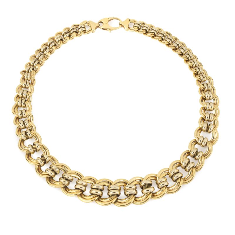 in oro giallo 18kt, composta da una doppia maglia concatenata digradante, punzone 750 e del fabbricante, cm. 46, gr. 62