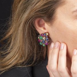 in oro rosa a basso titolo, con diamanti taglio brillante, zaffiri, smeraldi e rubini cabochon e sfaccettati, chiusura a clip, dim. cm 3.2x2.4, gr.23 complessivi