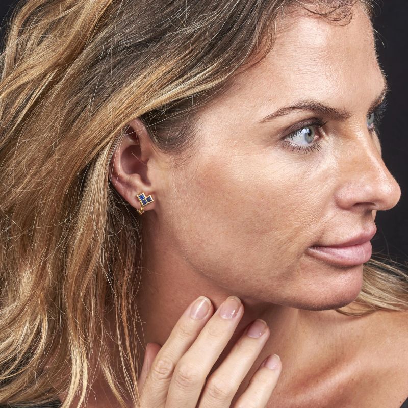 in oro giallo 18kt, con zaffiri taglio carrè per ct. 0.70 circa, chiusura a cilp, punzone 750, dim. cm 1.3x1.1, gr. 4