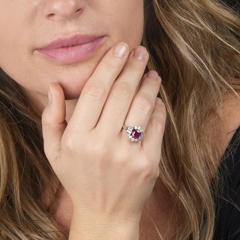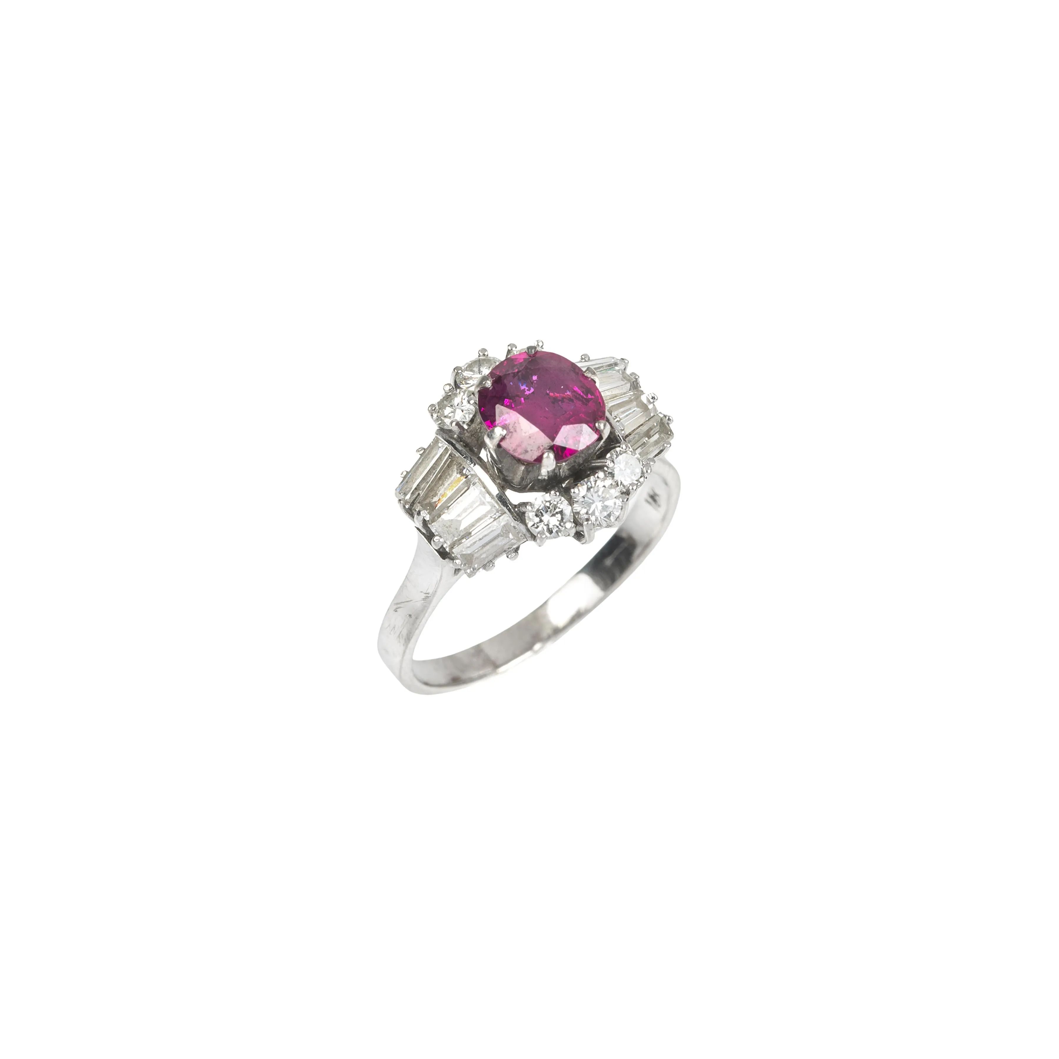 in oro bianco 18kt, al centro un rubino taglio ovale di ct. 1.20 circa, circondato da diamanti taglio brillante e tapes per ct. 1 circa, punzone 18kt, mis. 12/52, gr. 4