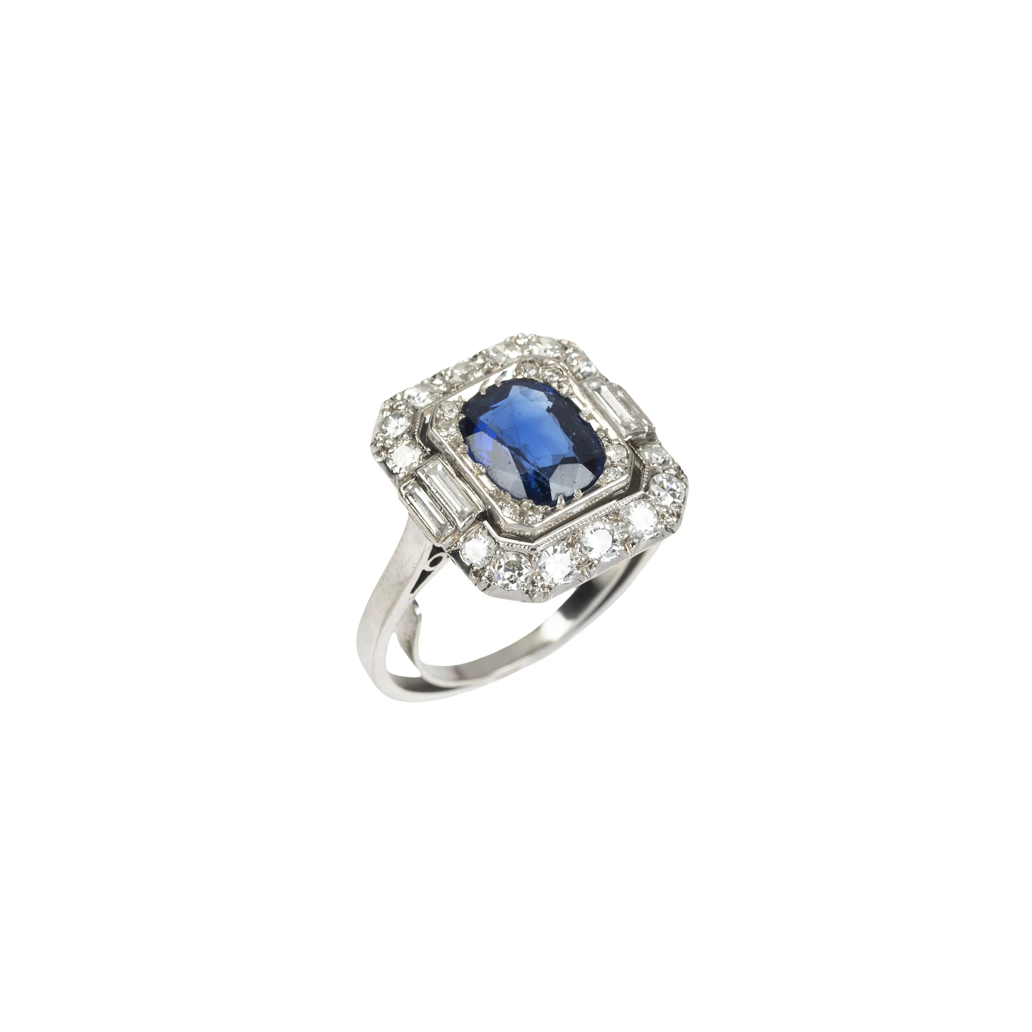 in oro bianco 18kt, impreziosito da zaffiro ovale di ct. 2 circa, diamanti taglio brillante e baguette per ct. 0.50 circa, mis. 10/50, gr. 5.5