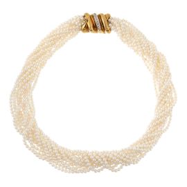 realizzata a dodici fili di perle di mm 2 circa, fermatura in oro giallo 18kt e impreziosita da diamanti taglio brillante per ct. 0.07, punzoni 750 e del fabbricante, lungh. cm 41, gr. 68