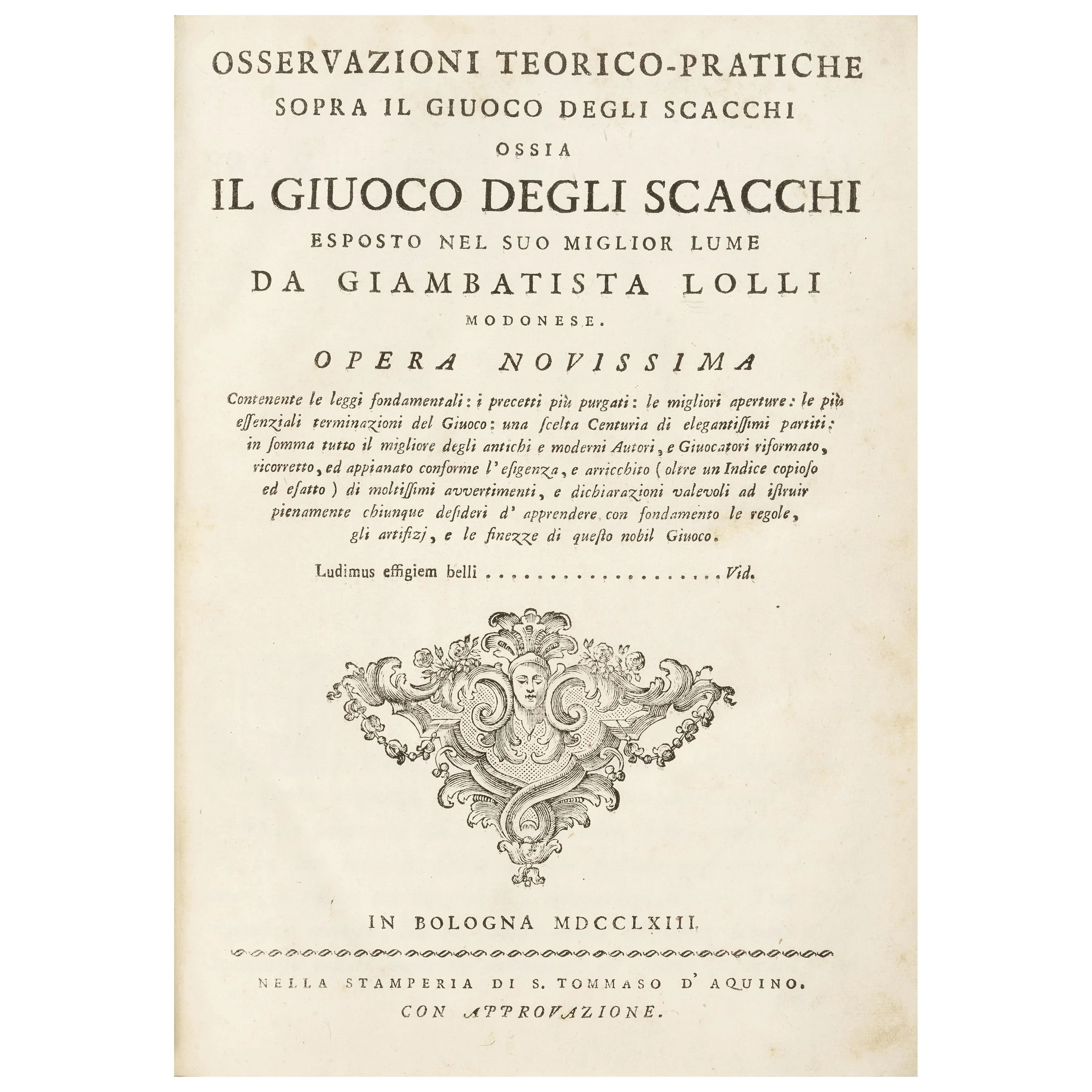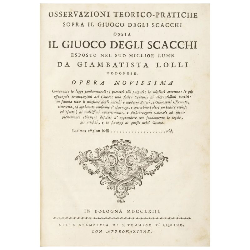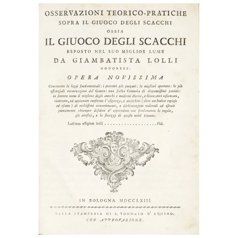 Lolli, Giambattista. Osservazioni teorico-pratiche sopra il giuoco degli scacchi. Bologna, Stamperia di S. Tommaso d'Aquino, 1763.