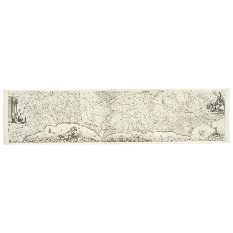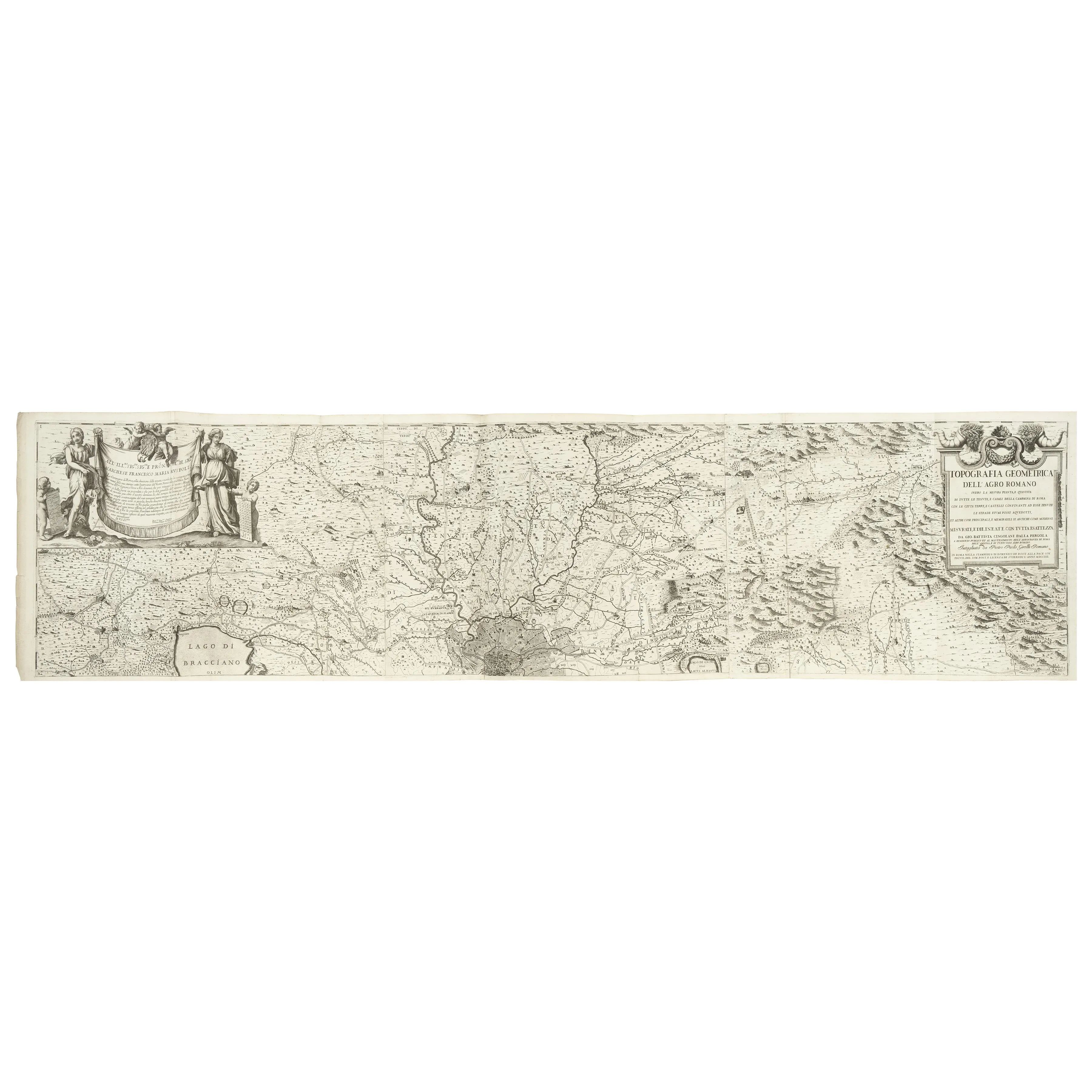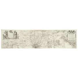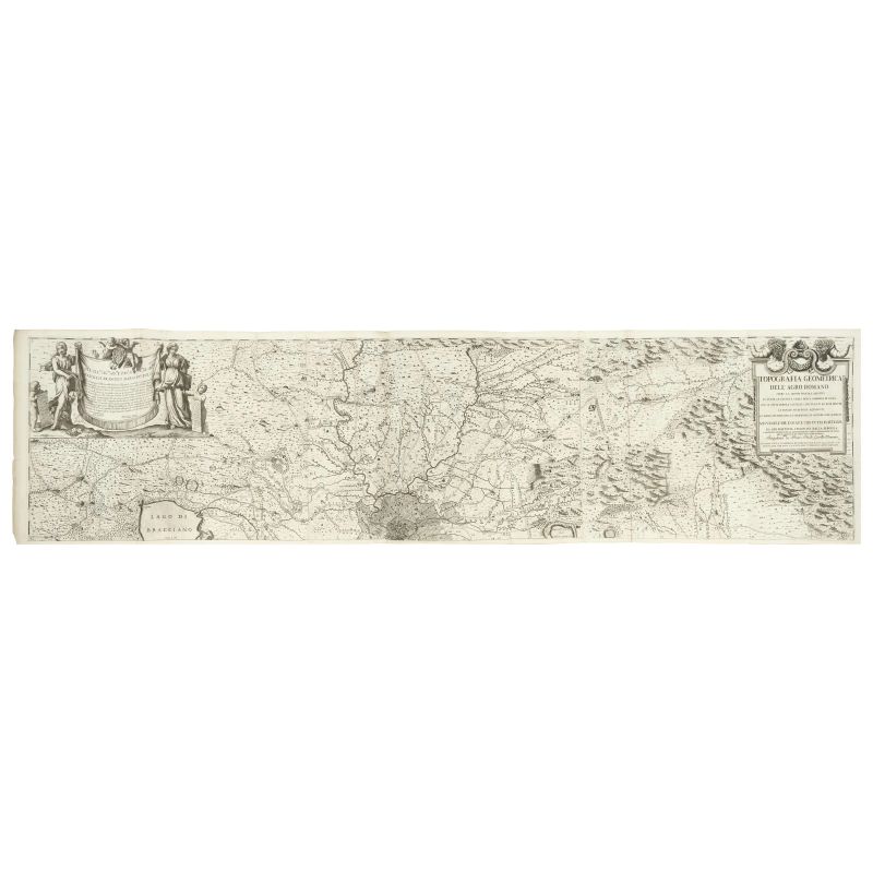 Grande carta geografica (900 x 1970 mm) incisa in rame su sei fogli giuntati tratta da disegno di Giovanni Battista Cingolani raffigurante il territorio che va da Ronciglione a Sermoneta e, sulla costa, da Santa Marinella a Foce Verde, due cartigli per dedica e titolo, Nettuno e un galeone nel mare, due scale per le misure ornate da figure (uno strappo lungo la vecchia piega.)