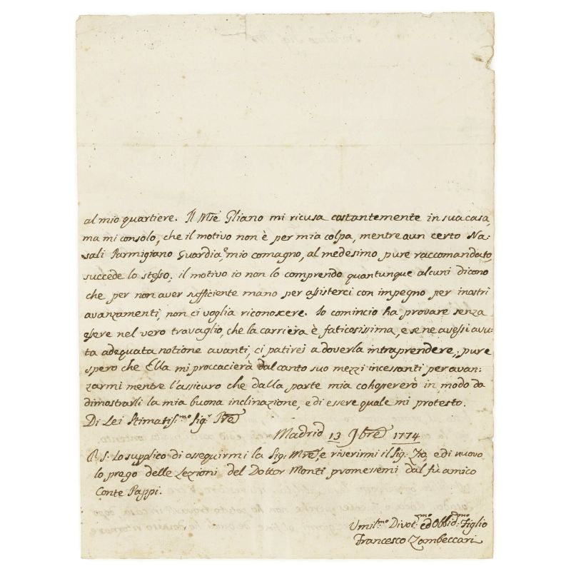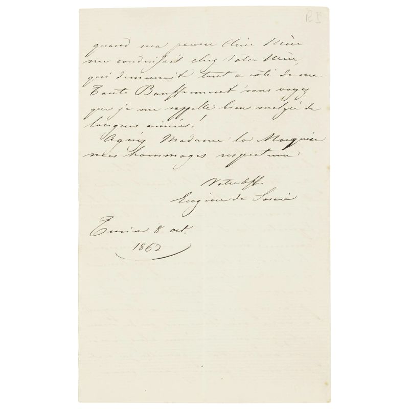 Lotto composto dalle seguenti lettere: una autografa di Eugenio di Savoia, Principe di Carignano di due pagine in ottavo datata 1862, una di Terenzio Mamiani indirizzata ad un ‘Carlino caro’ del 1848, una lettera autografa di due pagine in quarto di Francesco Zambeccari, e una bella lettera di 3 pagine in quarto di Giovanni Berchet. In aggiunta nel lotto anche una lettera di Guido da Verona.