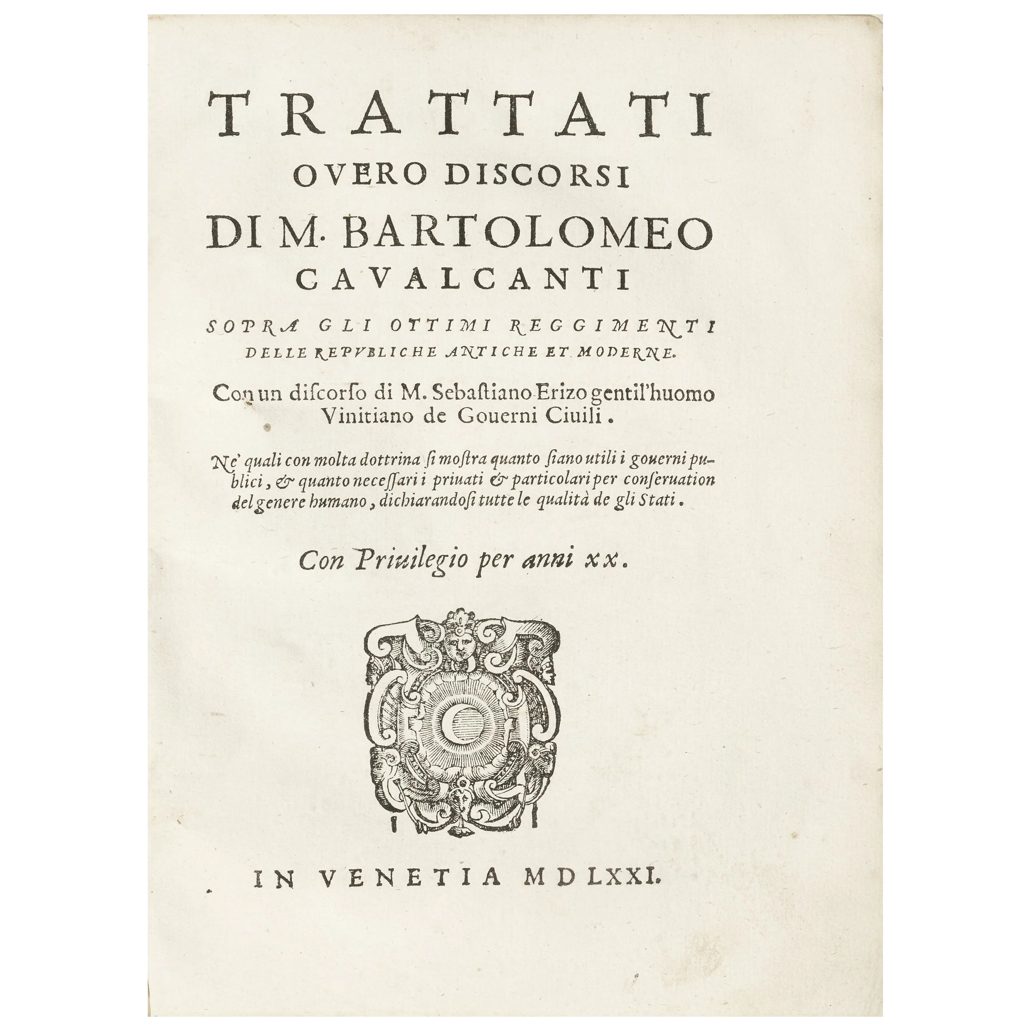 Cavalcanti, Bartolomeo. Trattati overo discorsi... sopra gli ottimi reggimenti delle repubbliche antiche et moderne. Venezia, Sansovino il Giovane, 1571.