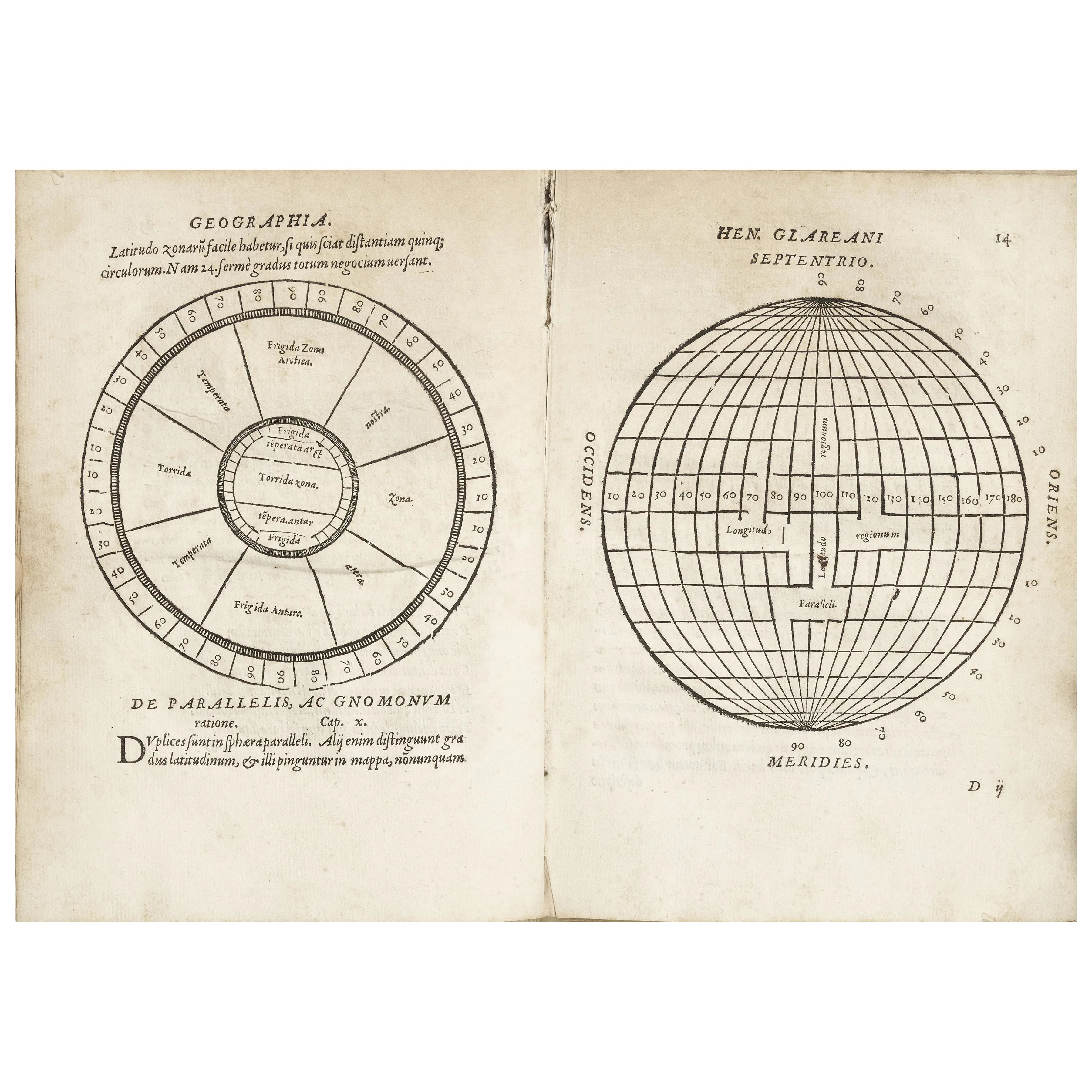 Distintosi come musicista, filologo, storico, matematico e geografo, Glareano fu amico di Erasmo e di vari altri eruditi del tempo. Nel De geographia, pubblicato per la prima volta a Basile nel 1527 e ancora in uso nel XVII secolo, determina per primo la deviazione dell'ago della bussola, menziona l’America, Colombo e Vespucci, espone un modo nuovo per costruire spicchi per globi. Bell’esemplare di questa non comune edizione.