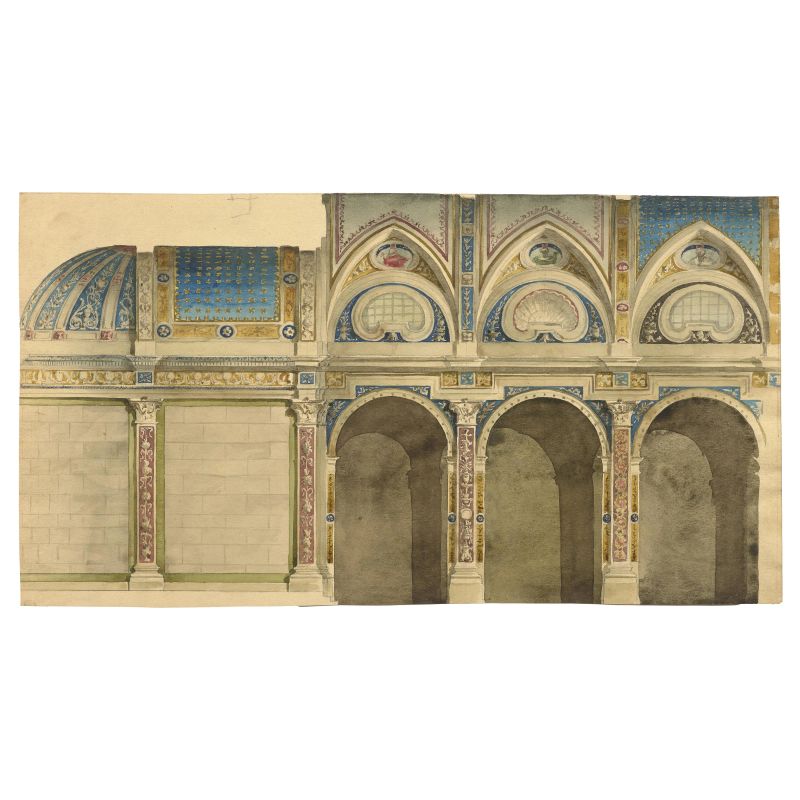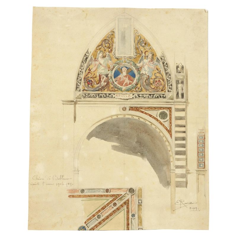 on the recto, lower left, in the drawing with a pediment of a lateral bay, pen and brown ink: "Chiesa di Bellano / dipinta l'anno 1906 907"; lower right, pen and brown ink: "E. Rusca / 5 1907"; lower right, in the drawing with ribbed vault, pen and brown ink: "E. Rusca"