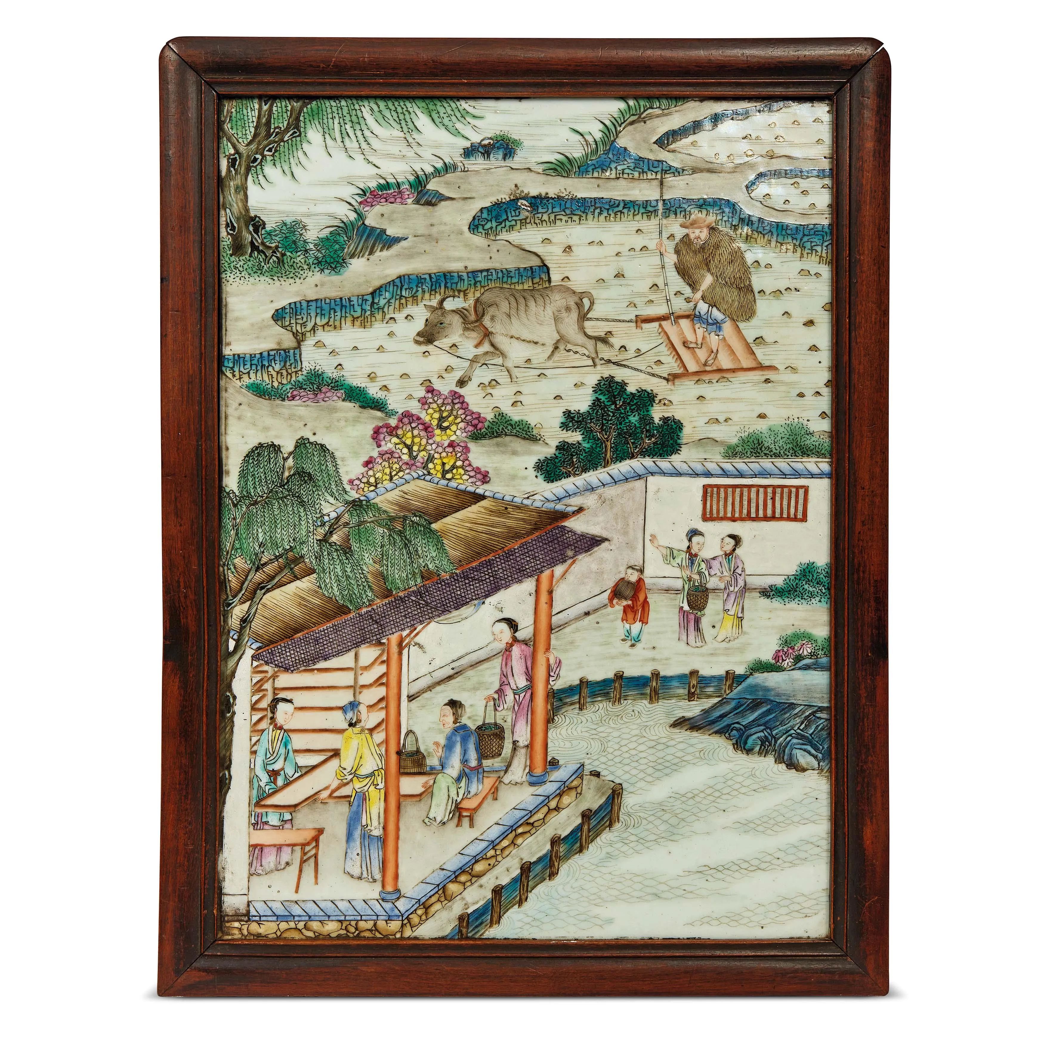 清 十九世纪 粉彩耕织图瓷板 尺寸38×28厘米