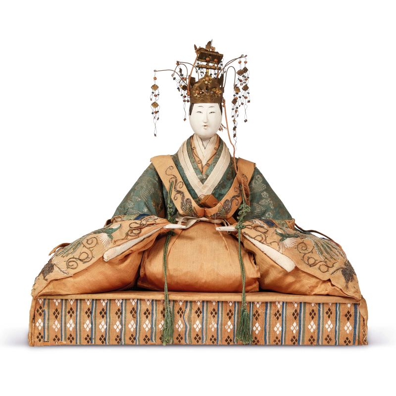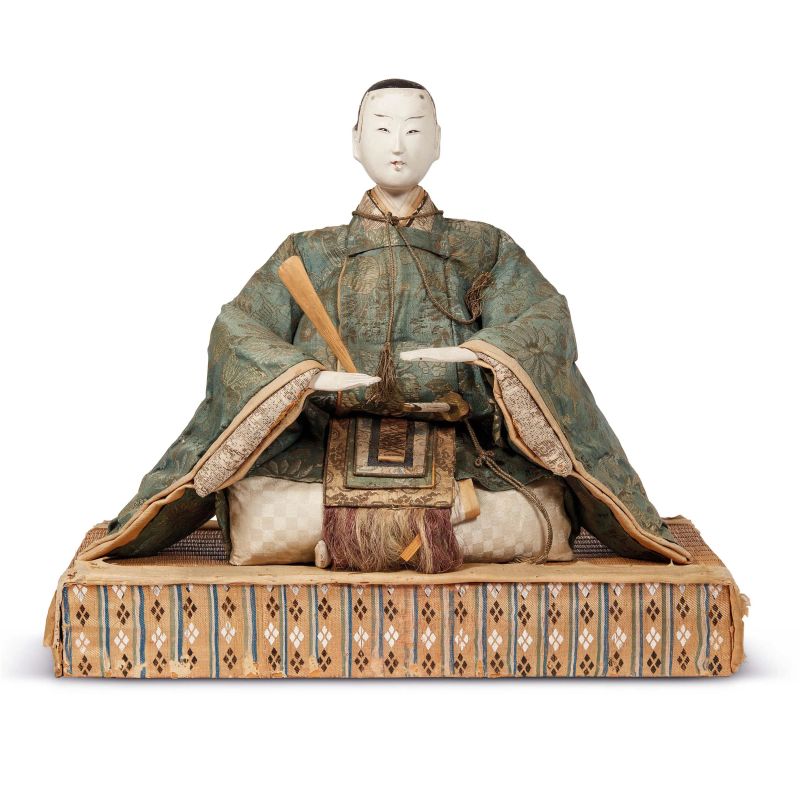 Bambole dairi-bina per la festa Hina Matsuri, raffiguranti imperatore e imperatrice in abiti di stile Heian, con volti in gofun dipinto.