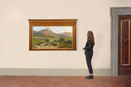 Dipinta a smalti policromi con paesaggi fluviali e montani alternati a fiori e rondini; interno decorato con corolle floreali.