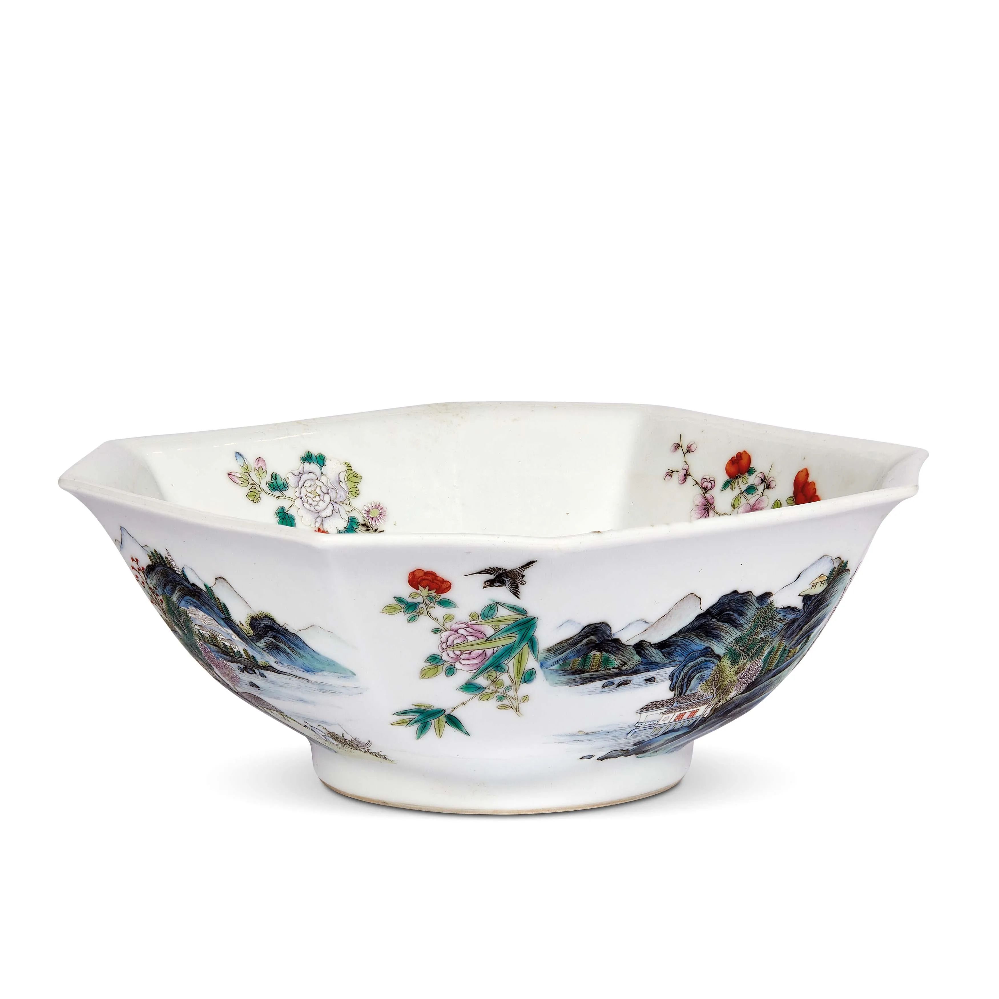 清 十九-二十世纪 粉彩花卉山水纹八方碗 6厘米