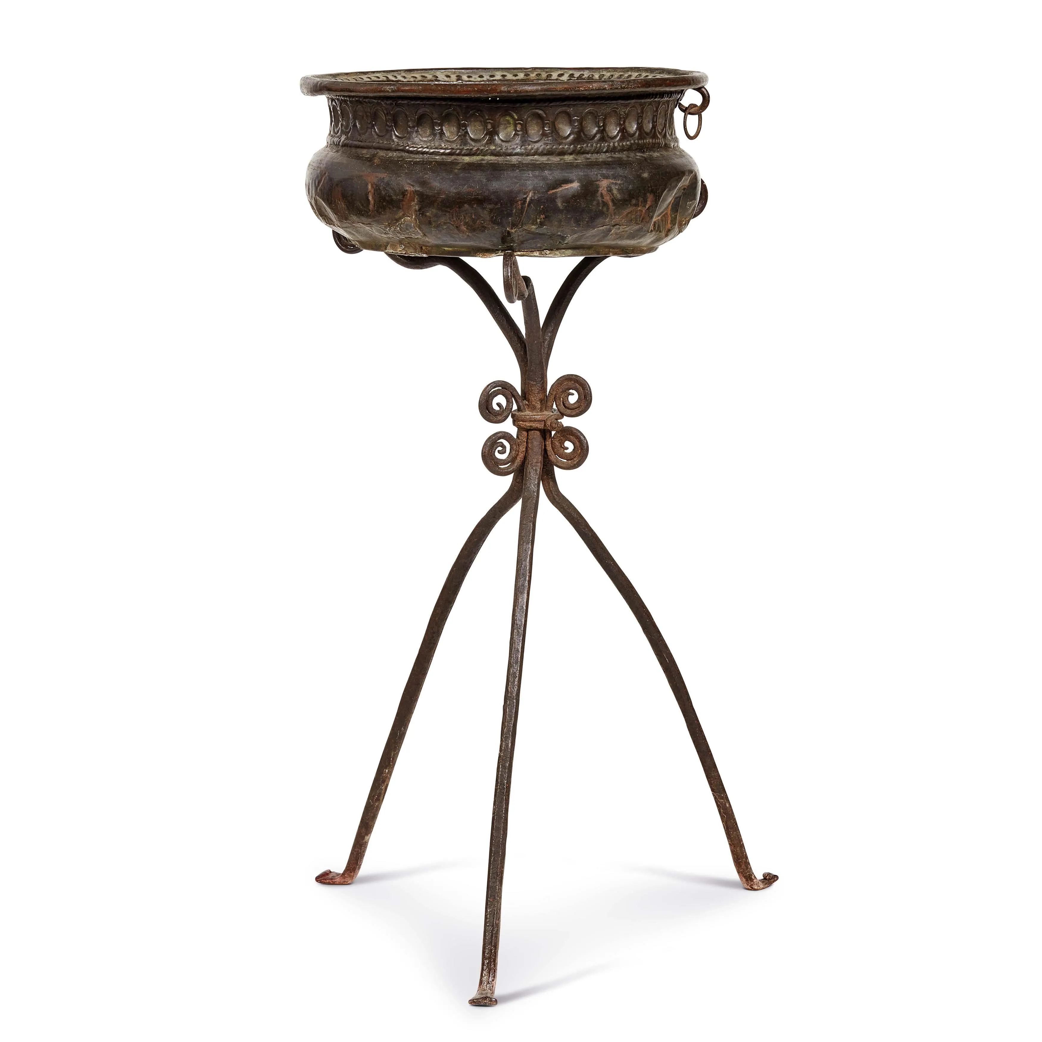 in rame e ferro battuto, il contenitore di forma circolare bombata con fascia decorata da fregio a motivi ovali, il sostegno tripode con decoro a ricciolo nella parte centrale, alt. cm 90, diam. cm 41,5