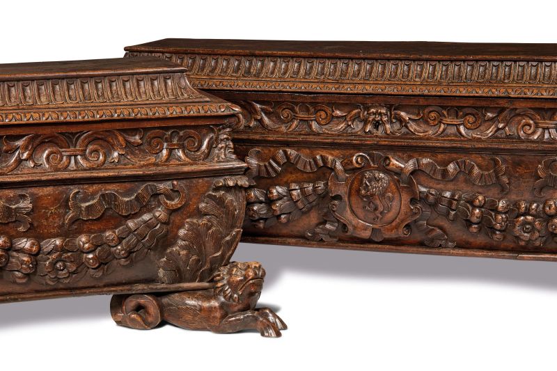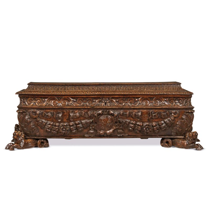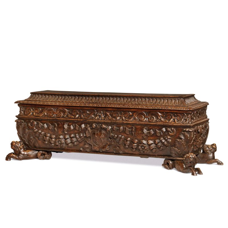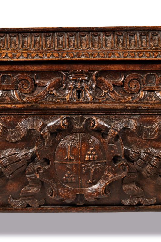 in legno di noce scolpito, di forma ad urna con coperchio piano che scende tramite fascia ad unghiature su bordo a fogliette, fronte centrato da stemma Chigi Della Rovere entro cartouche da cui pendono copiosi festoni di fiori e frutta e nastri svolazzanti, fascia superiore interessata da girali fogliacee racchiuse da nastrini e centrate da mascherone che decora anche gli angoli, poggia su piedi in foggia di piccolo leone disteso, cm 60x193x61,5