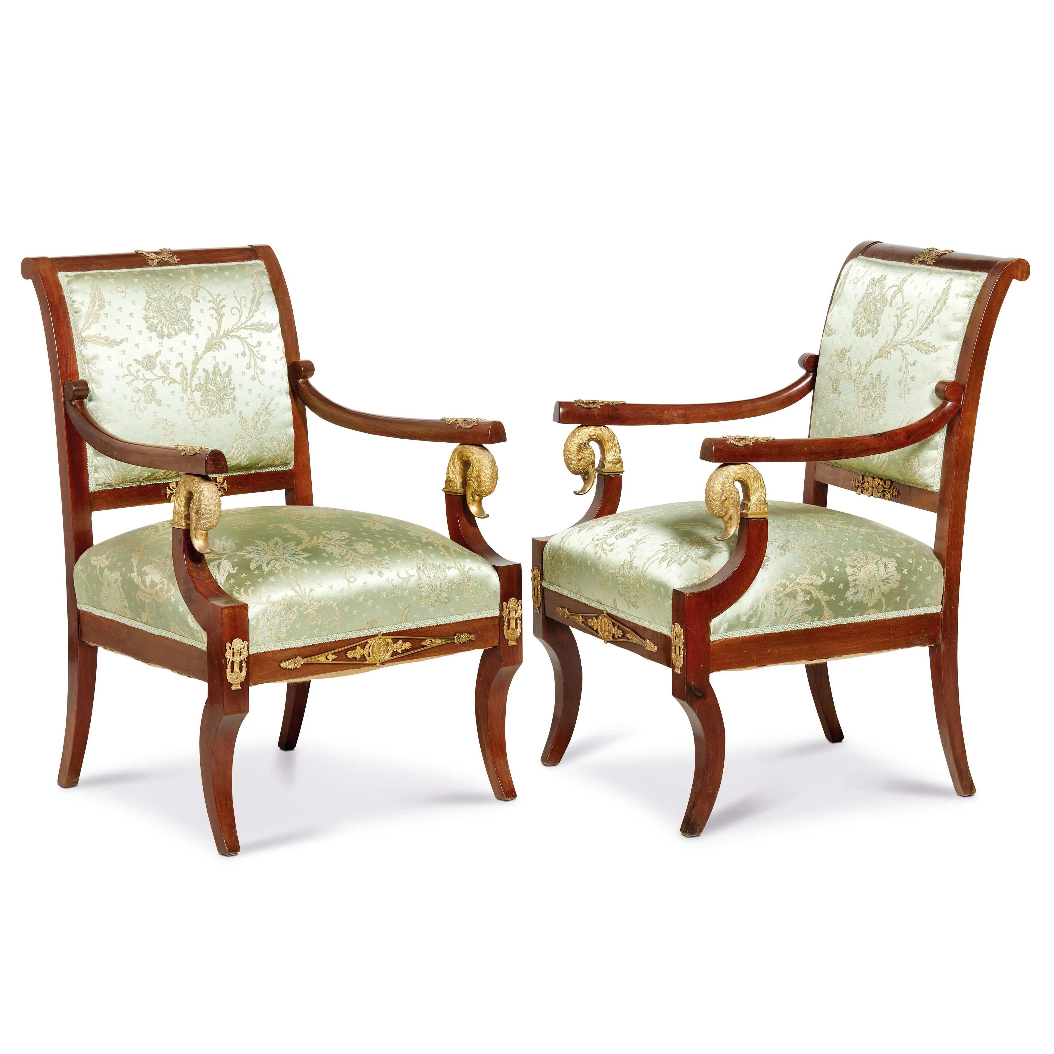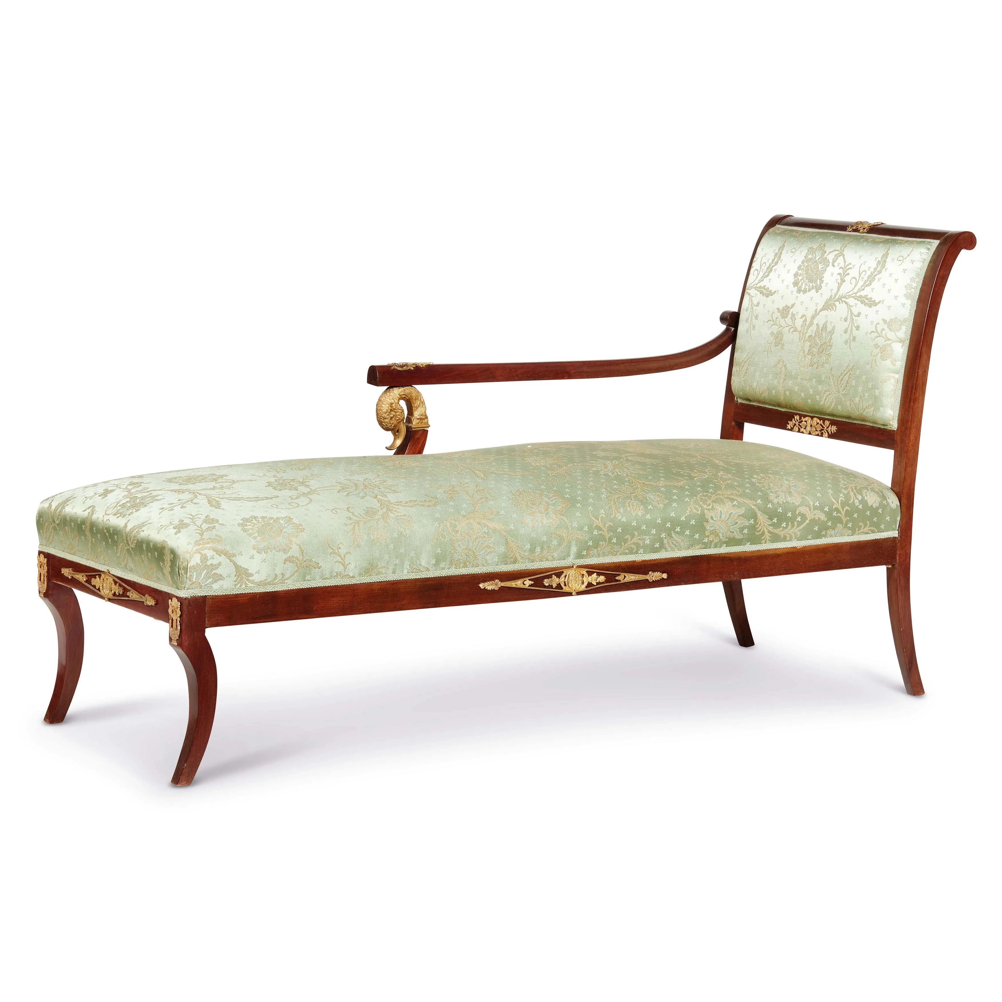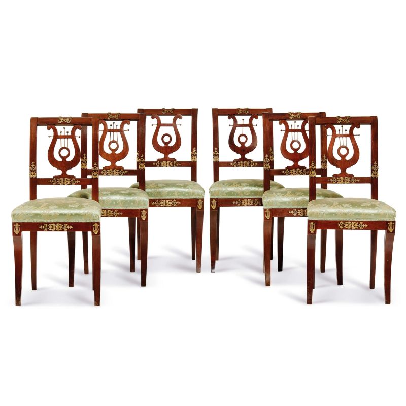 in mogano con fregi in bronzo dorato; le sedie presentano intaglio a giorno a motivo di lira sulla cartella lievemente ricurva, di linea dritta e con lunghe gambe a sciabola, cm 87x42x45; la coppia di poltrone è caratterizzata da sostegni in foggia di testa di cigno dorato dal becco sporgente, cm 88,5x59,5x67; la dormeuse presenta da un lato schienale lievemente ricurvo all'esterno da cui si sviluppa un lungo bracciolo sorretto da testa di cigno, schienale e lunga seduta sono rivestiti da tessuto verde a ramage fiorito, su gambe a sciabola, cm 88x170x59