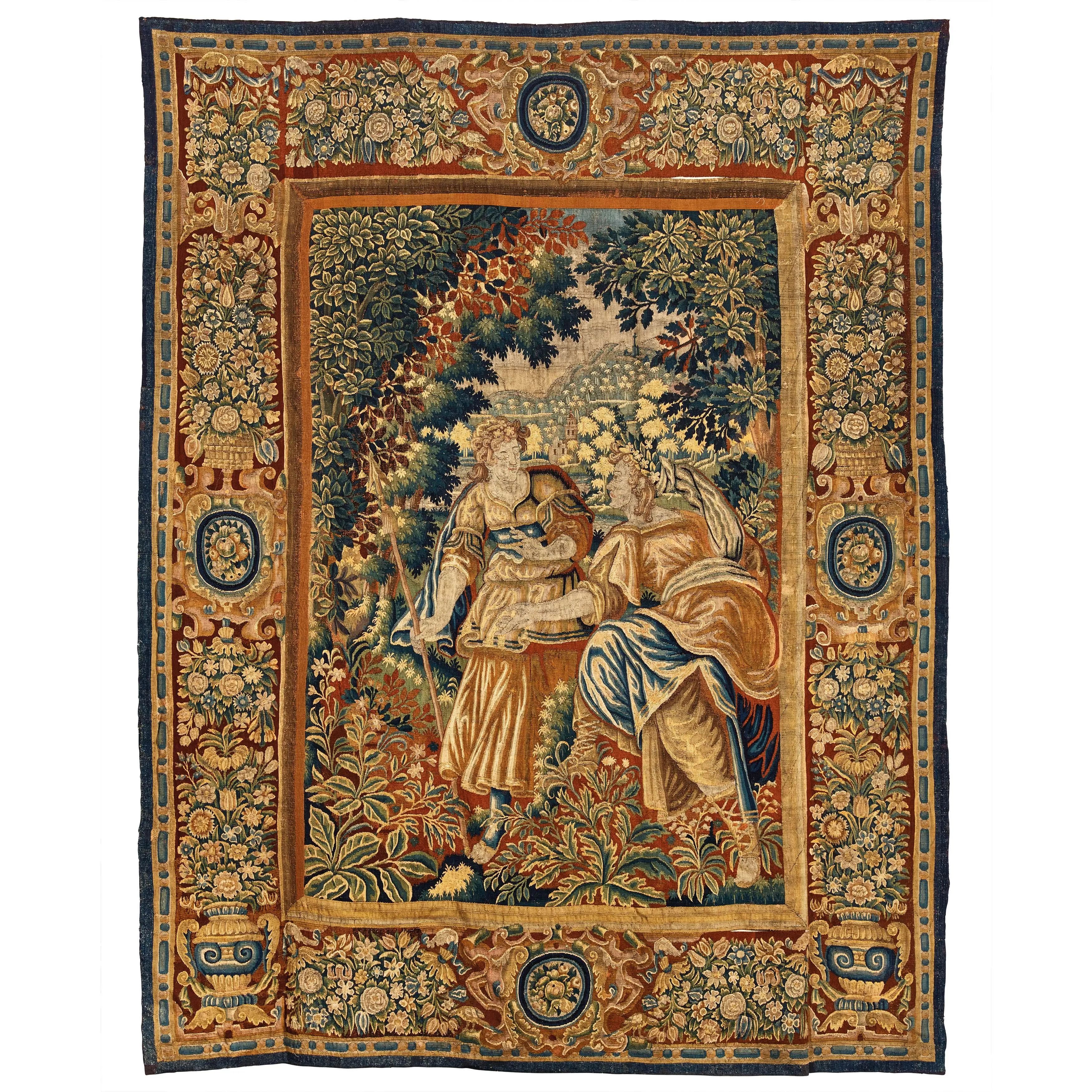 raffigurante l'incontro tra due figure in un paesaggio delimitato ai lati da alberi e cespugli. La scena è incorniciata da un'ampia bordura interamente decorata da vasi e composizioni floreali e centrata sui quattro lati da medaglioni circolari, cm 338x260
