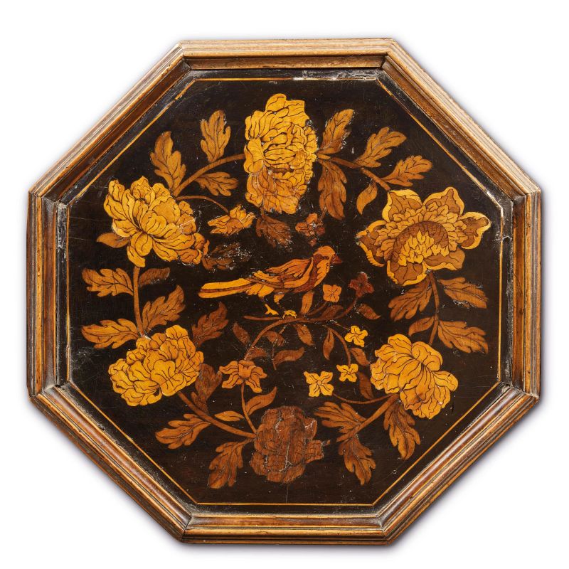 in legno intarsiato, ebanizzato e dorato. Piano di appoggio di forma ottagonale riccamente intarsiato a motivo floreale a incorniciare un passerotto su ramo, fusto parzialmente a torchon con elementi sferici dorati, base ottagonale interessata da decoro a ghirlanda di fiori analogo a quello del piano, poggiante su piedi a sfera schiacciata, cm 79x40x39