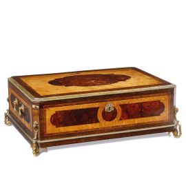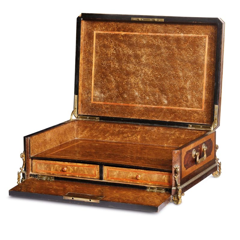 intarsiata in legni vari con applicazioni in bronzo dorato, coperchio centrato da grande riserva polilobata si apre a celare ampio vano e due cassetti sottostanti, ai lati maniglie in bronzo dorato; sulla chiusura incisione P. SORMANI BTE À PARIS, cm 18x51x36