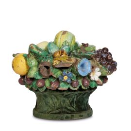 in terracotta invetriata policroma, modellata a raffigurare una ricca composizione di frutta e verdura adagiata su un letto di foglie, e abitata dai consueti “protagonisti” della bottega robbiana, ossia alcuni animaletti da aia (ranocchia, lumaca, cicala). La conformazione esuberante dei frutti, l'abbondanza e varietà degli animaletti e la cromia assai carica suggeriscono l'attribuzione alla mano di Giovanni e della sua bottega, maggiormente attenti ai valori dell’ornato rispetto agli altri artisti attivi nel periodo; alt. cm 18 e diam. cm 27 (poggiante su base circolare in legno rivestito in velluto verde).