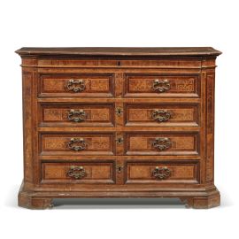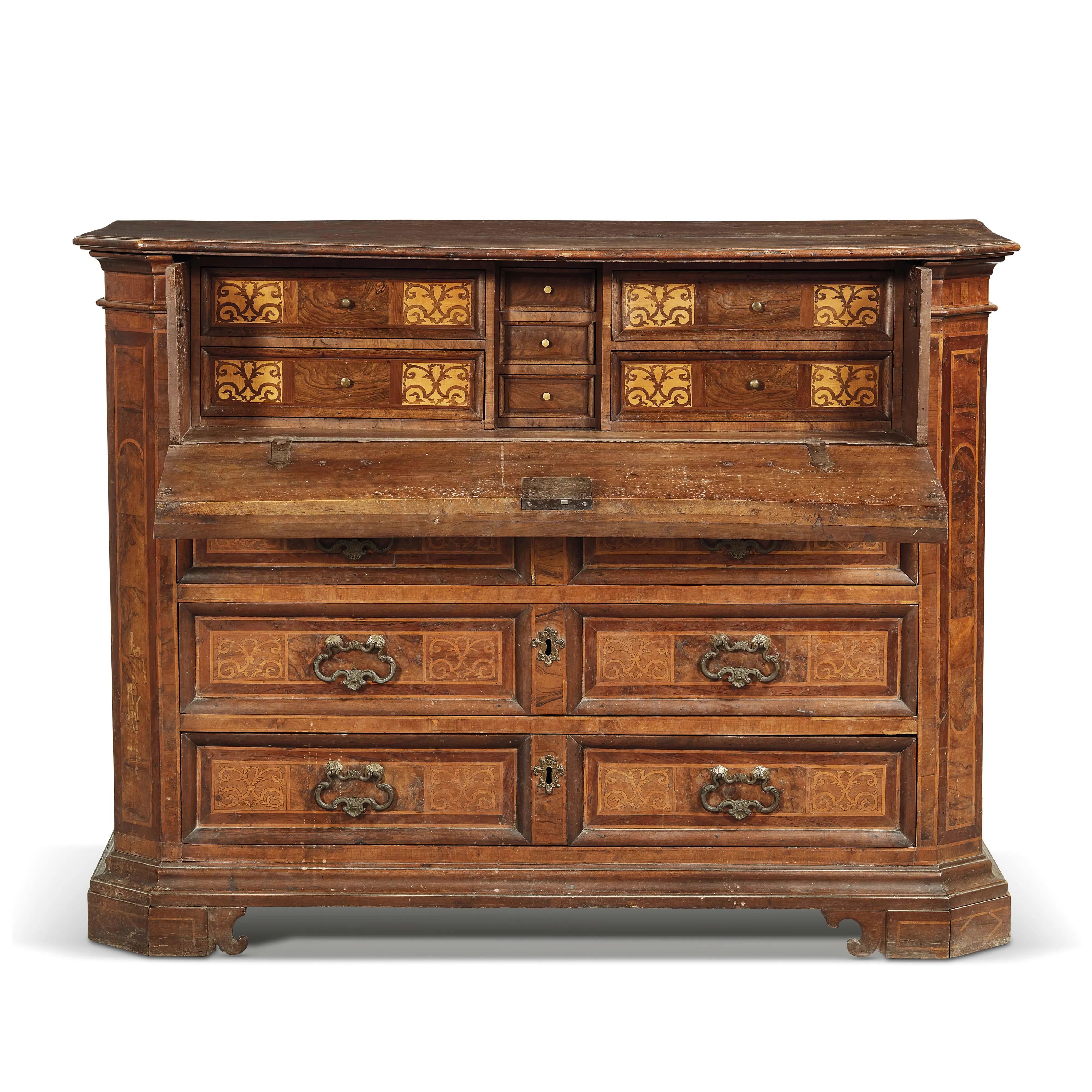 in noce, piano di forma rettangolare scantonato sugli angoli anteriori, fronte a quattro cassetti di cui il primo ribaltabile, che ospita una serie di cassetti di varie dimensioni, a cui seguono altri tre cassetti sottostanti ornati da filettature e decori a rabeschi; agli angoli due paraste anch'esse impreziosite da filettature di forma geometrica, fianchi dritti sformellati e filettati, terminante su base modanata, cm 115x151x69