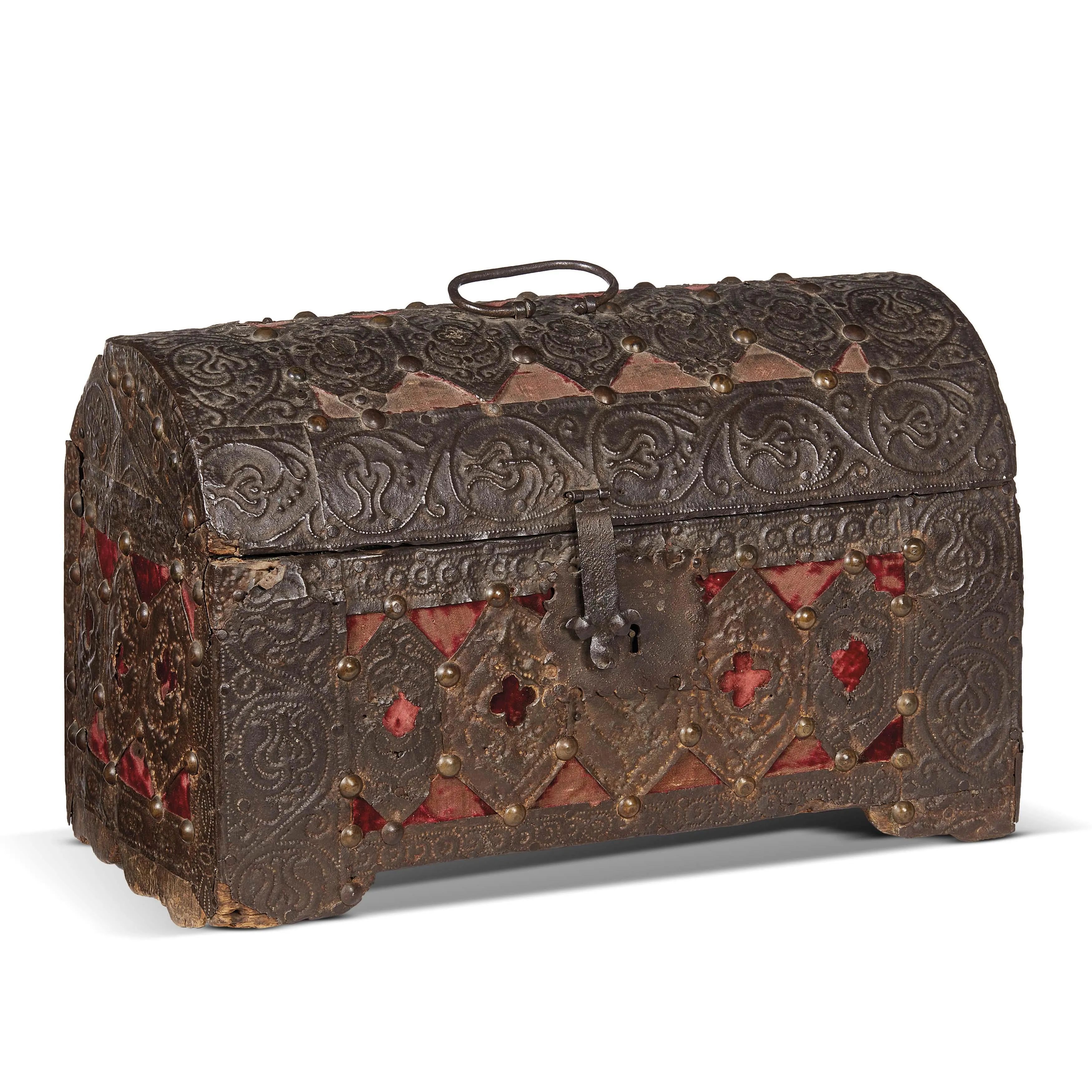 in legno rivestito in lamina metallica con borchie e velluto rosso, decorazione a losanga e a motivi stilizzati a rilievo lungo il corpo e sul coperchio, cm 25x40x21,5