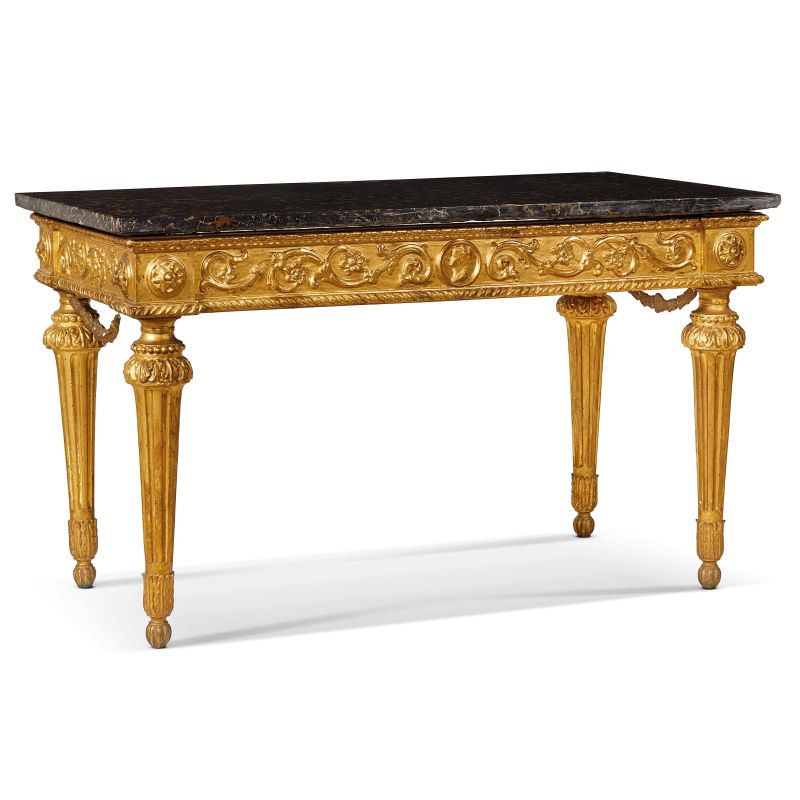 in legno intagliato e dorato, piano in marmo Portoro, fascia intagliata a volute vegetali e fiori e centrata da medaglione con profilo femminile, agli angoli medaglioni con fiori, ai lati pendono festoni di fiori, su gambe troncopiramidali scanalate terminante in sfere, cm 89x150x81