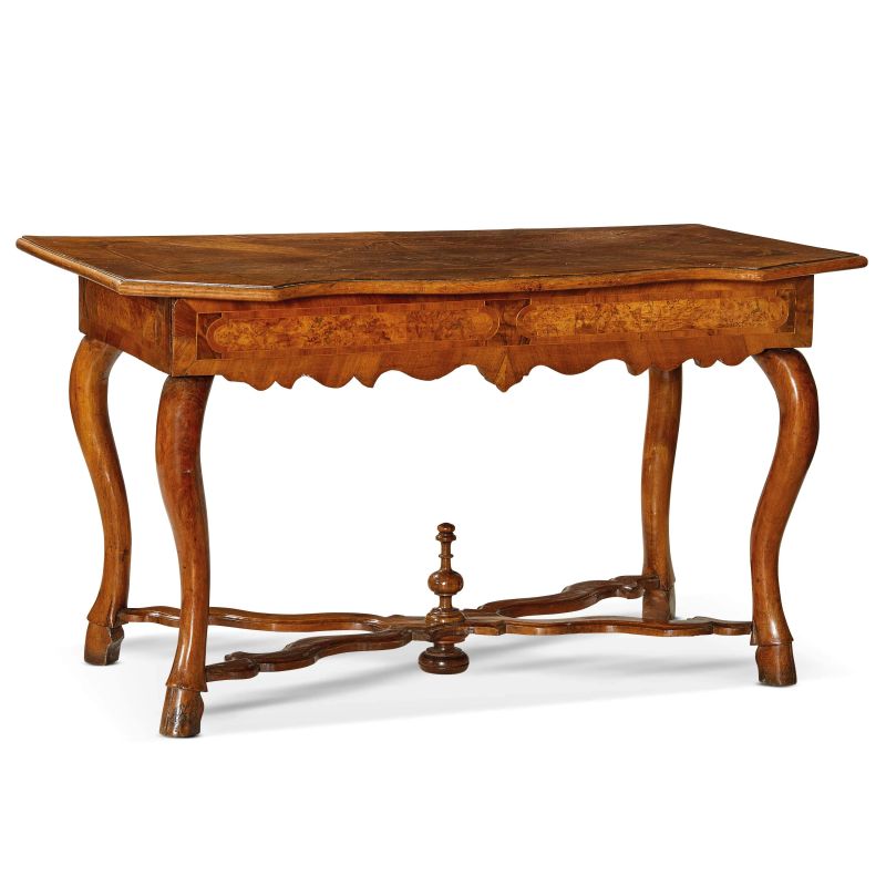 in legno lastronato e intagliato, piano leggermente sagomato con angoli di linea spezzata, presenta al centro una profilatura a losanga, fascia a unico cassetto interessata da lastronatura entro riserve geometriche e bordo inferiore mistilineo, sorretto da quattro gambe terminanti in zoccolo e traverse unite al centro da elemento tornito, cm 79x141x76