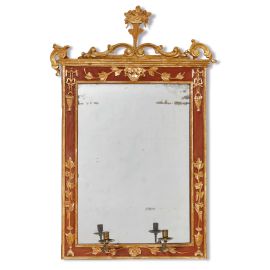 in legno intagliato, laccato rosso e dorato di forma rettangolare, cimasa a rocaille sormontata da mazzo di fiori; la cornice presenta intaglio a motivo floreale, alternato a vasi di fiori, nastri e fiocchi; complete di due portacandela in bronzo dorato, cm 94x54