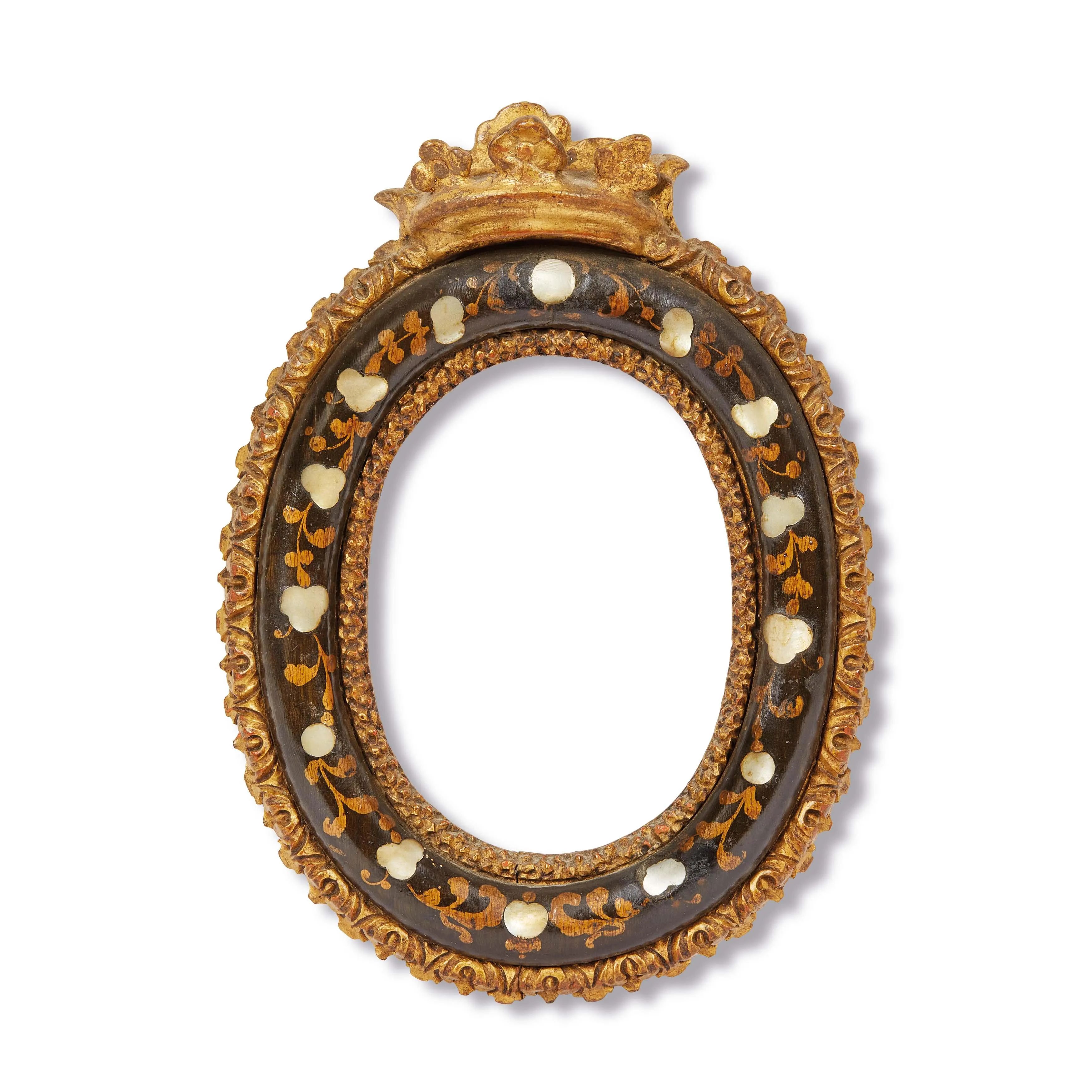 in legno parzialmente dorato di forma ovale con intarsi in madreperla e fascia esterna intagliata a mezzefoglie, cimasa sagomata a corona, ingombro 19,8x14,5, luce cm 10,8x8 ovale