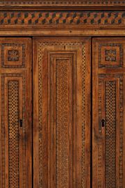 in noce intarsiato alla certosina in diverse essenze a comporre una fitta trama di cornici a tessere multiformi e a disegno geometrico. Sobria impostazione architettonica con piano sotteso da modanature e filettature a simulare dentelli, fronte scandito da tre lesene piatte e due ante impreziosite da maniglie sagomate in ferro battuto su placca romboidale, fascia del basamento intarsiata a motivi geometrici, cm 138x265x74