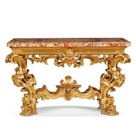 in legno riccamente intagliato e dorato, piano lastronato in marmo rosso poggiante su fascia modanata lavorata ad incisioni geometriche e centrata da mascherone da cui si sviluppa motivo a volute fogliacee, su gambe a roccaille centrate da mascheroni e riunite al centro da volute terminanti in bouquet di foglie, piedi a girali su base polilobata, cm 102x163x87