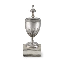 base quadrangolare appesantita su cui poggia la coppa decorata da foglie in rilievo, coperchio traforato, alt. cm 44, g 2290 lordi