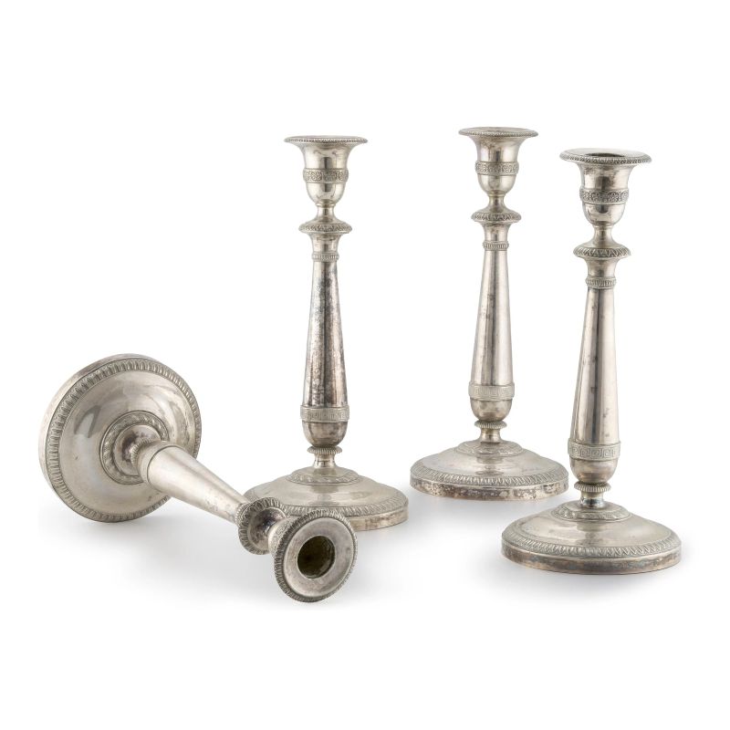 FOUR SILVER CANDLESTICKS, MILAN, 19TH CENTURYQUATTRO CANDELIERI, MILANO, SECOLO XIX