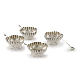 FOUR LITTLE STERLNG SILVER SALT CELLARS, LONDON 1887, MARKS OF CARLO STUART HARRIS AND FOUR STERLING SILVER SALT CELLAR, SHEFFIELD, 1888, MARK OF WALKER & HALL