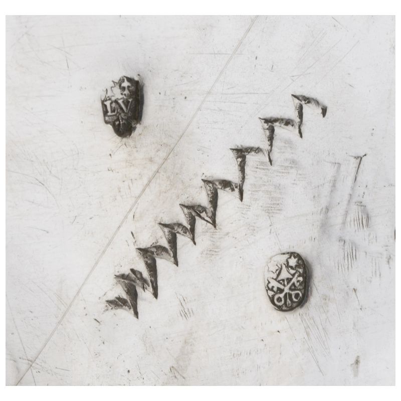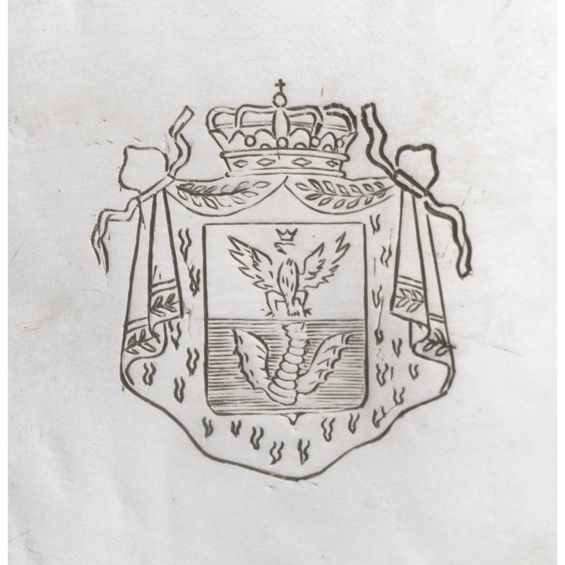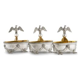 in argento, di forma ovale poggianti ciascuna su piedini zoomorfi, profilo perlinato e corpo decorato da festoni in rilievo trattenuti da teste ferine. Ciascuna è dotata di una vaschetta interna in argento dorato a due alloggi. Finale ad aquila su sfera. Sul fondo inciso lo stemma coronato della famiglia Borghese, cm 15x9, complessivi g 4020