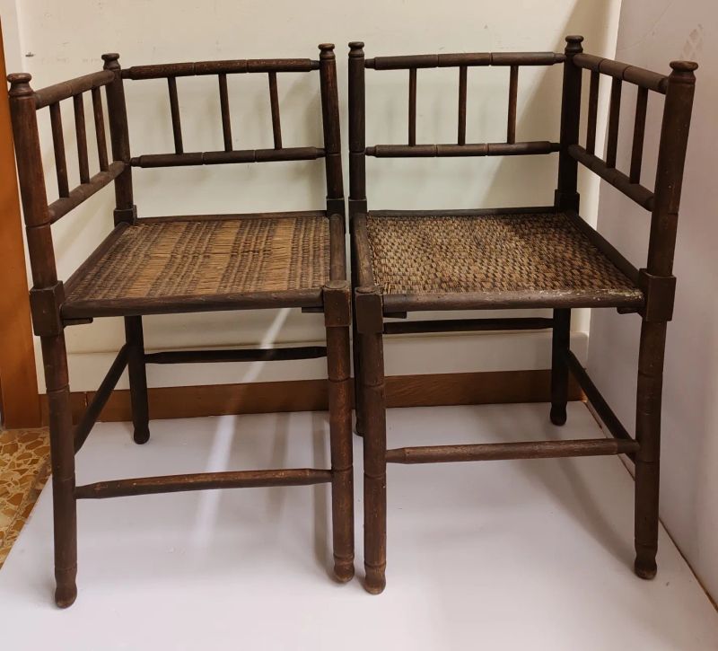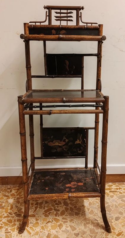 Etagère in bambù con ripiani e pannelli in legno laccato e fondo nero e decorato in policromia con "chinoiserie" di fiori e volatili, inizio sec. XX, cm 119x51x32, danni e mancanze e coppia di seggioline d'angolo con sedile in canné e schienali con stecche tornite, gambe cilindriche con traverse, inizio sec. XX, danni