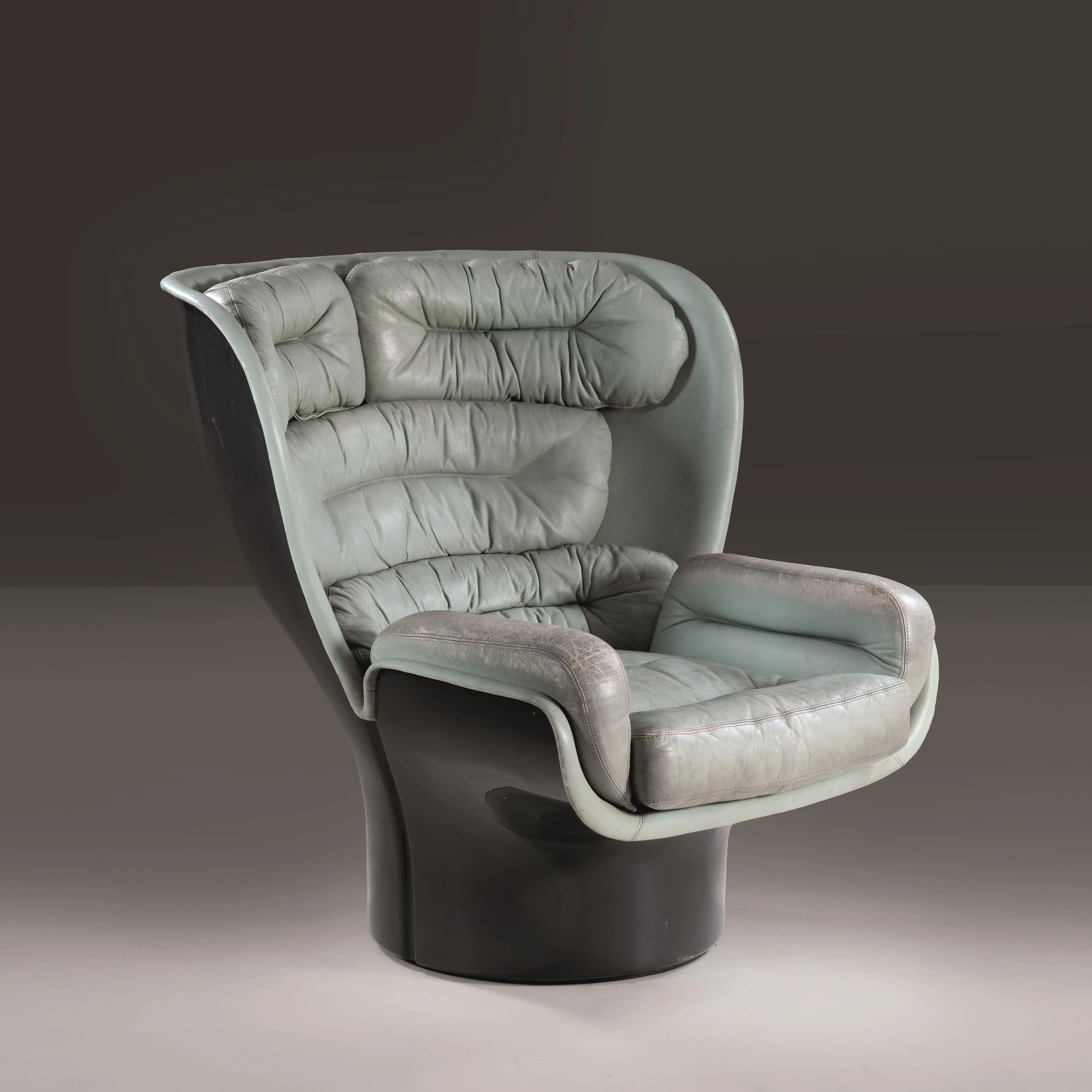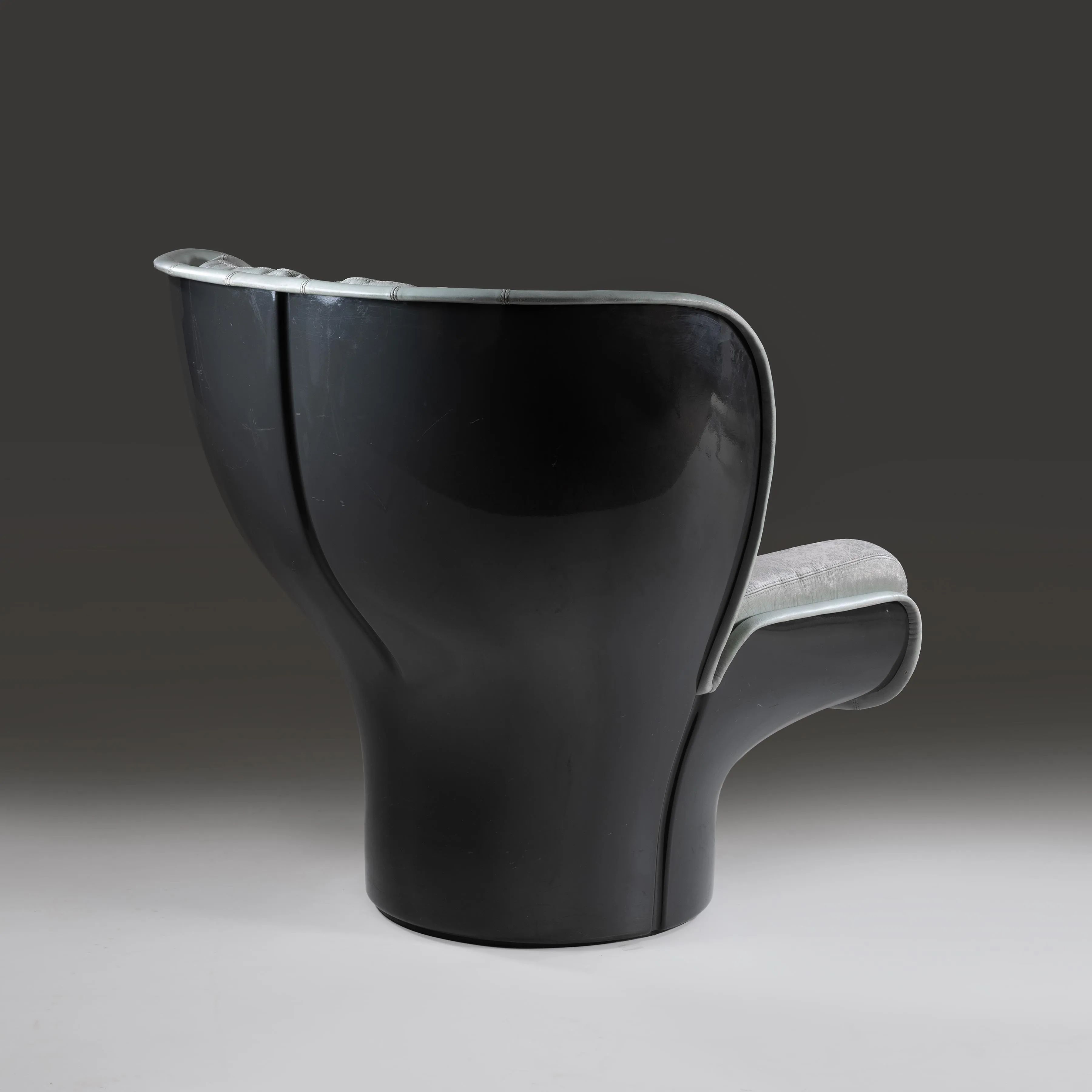 struttura in vetroresina nei toni del grigio, imbottita e rivestita in pelle nei toni dell’azzurro
